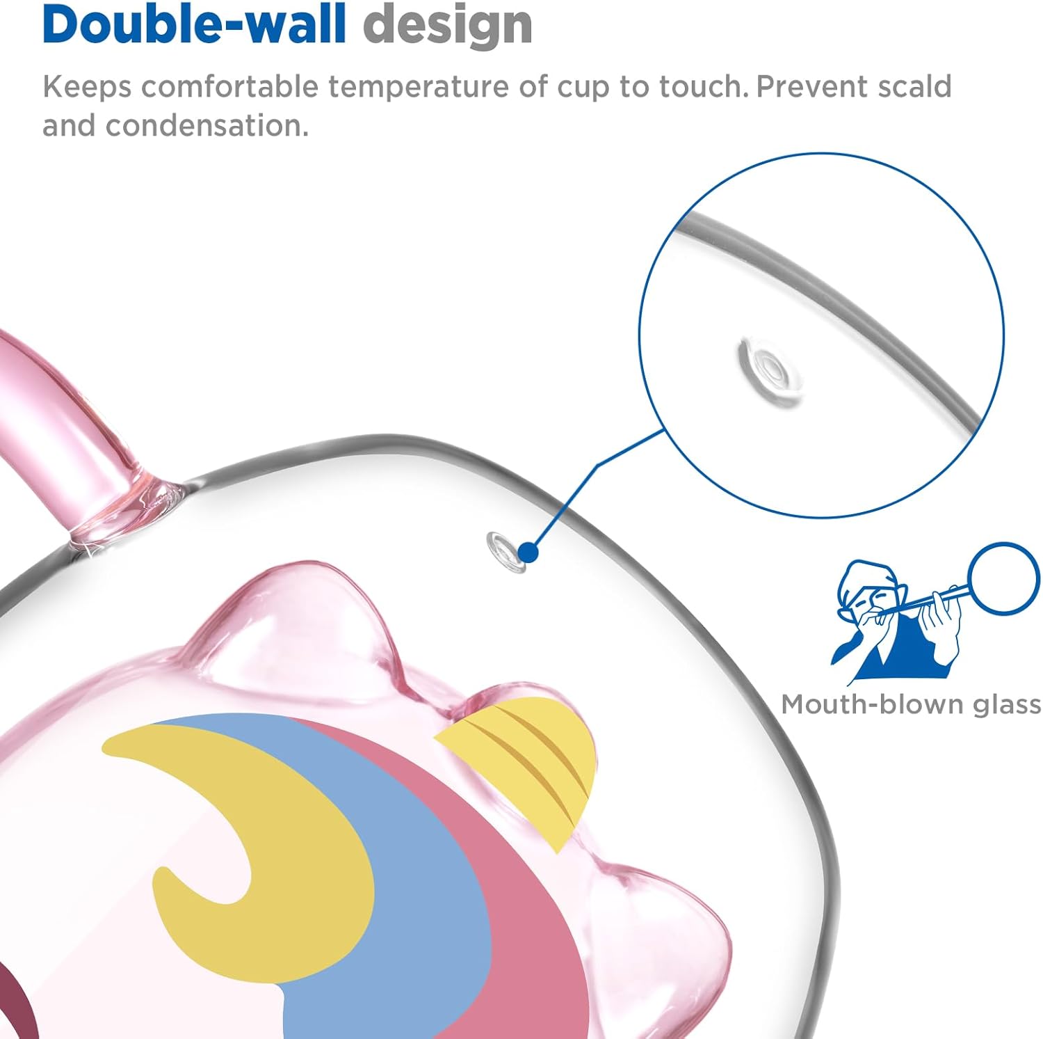 ecooe Cute Unicorn Mug Double Walled Glass Mug 9.4oz Coffee Cup Cappuccino Latte Glass Milk Tea Cup with Handle Spoon, Birthday Christmas Valentine's Day for Women Wife Mum Kids Friends Teachers