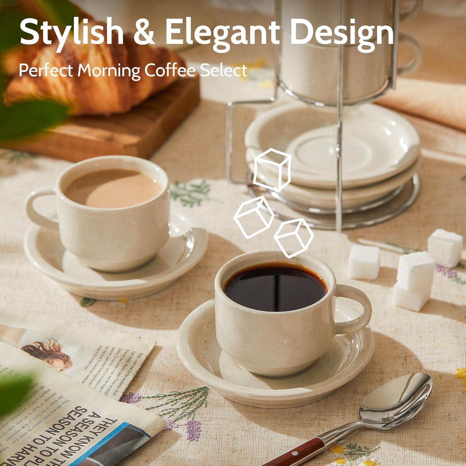 Sweese Porcelain Espresso Cups Set, 2.5 oz, with Saucers, Metal Stand, Stackable - Dove Grey, 4 Pack