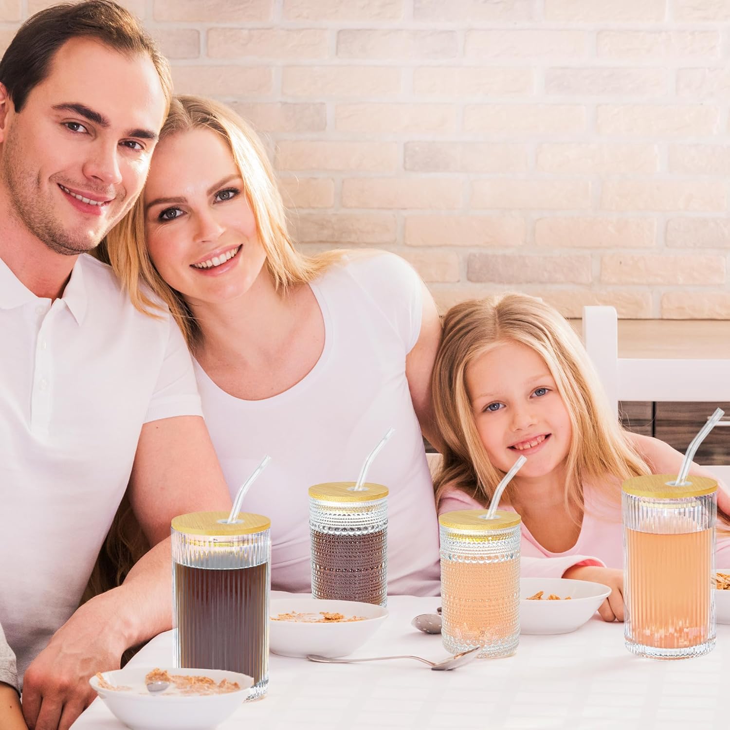 - Product Configuration: The glassware sets include: 14oz hobnail glass cups*4, bamboo lids *4, glass straws*4, straw brushes*2. The size of these drinking glasses is 2.75'' W x 4.92'' H. Our glassware set features bamboo lids and reusable glass straws, promoting an eco-friendly concept.