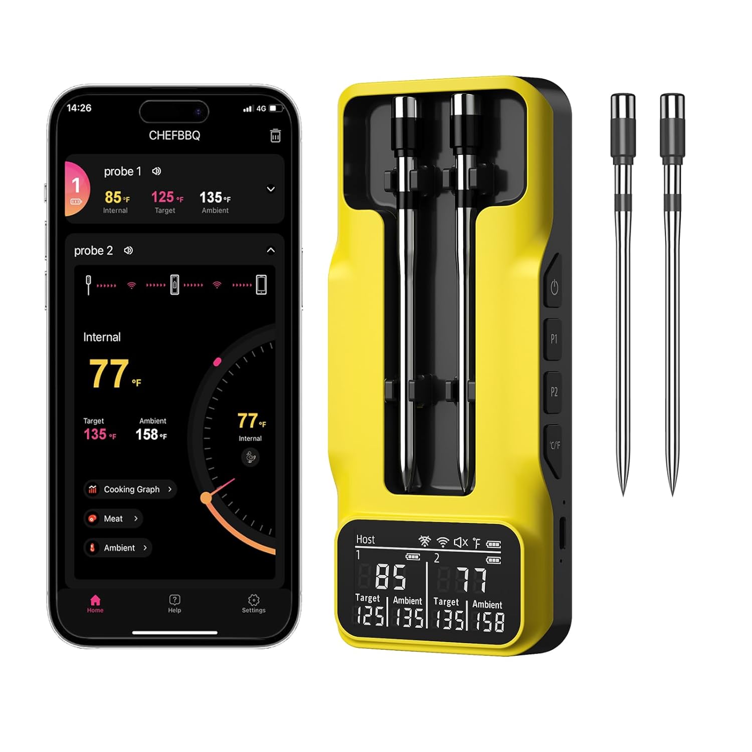 - Instantly Alerts Reminder: You can view the cooking thermometer on the host display screen without using a smart APP. You can also monitor cooking time, set desired temperature, and receive alerts through the CHEFBBQ APP on your phone.