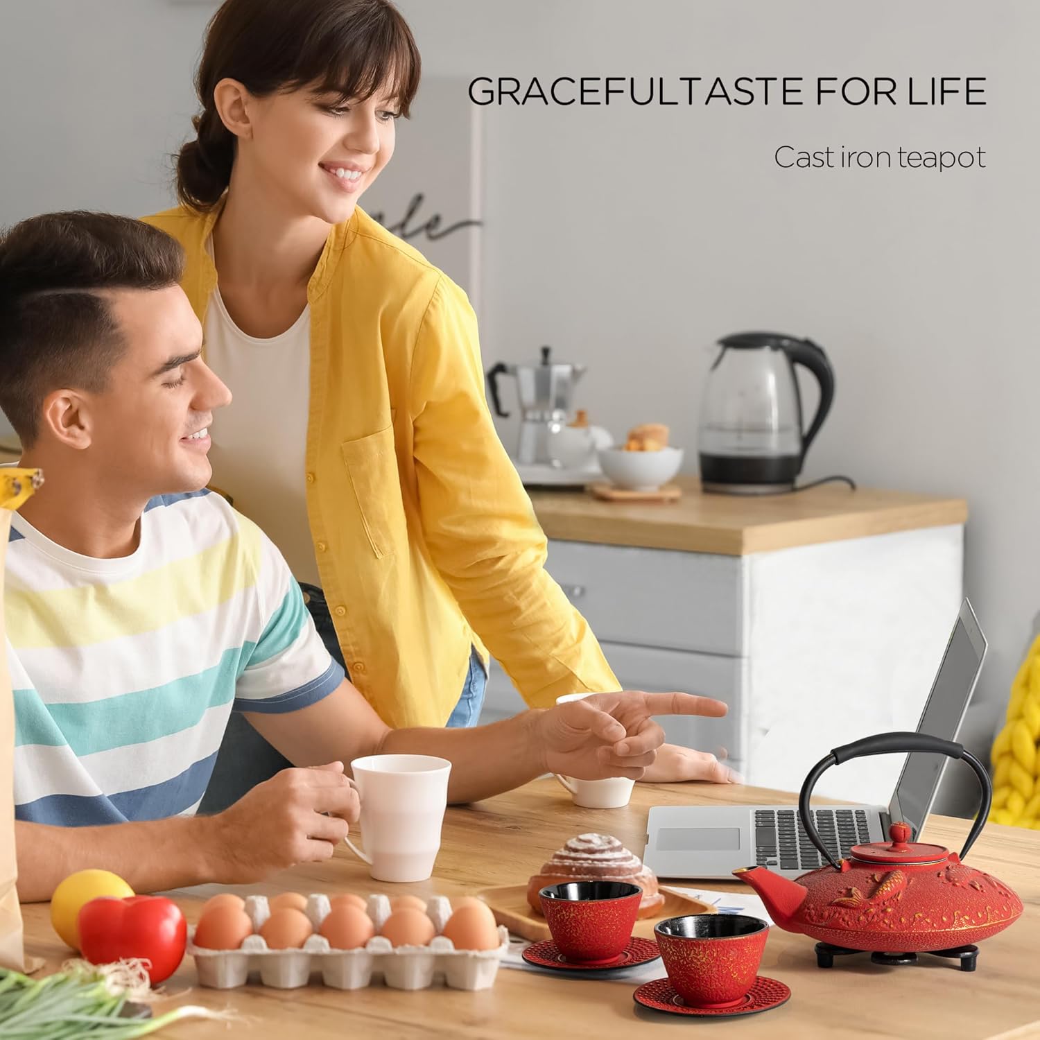 Cast Iron Teapot Set with 2 Tea Cups, 7Pcs Japanese Tea Kettle with Stainless Steel Infuser, Tea Pot Coated with Enameled Interior, Fish Pattern, 27oz 780ml Red