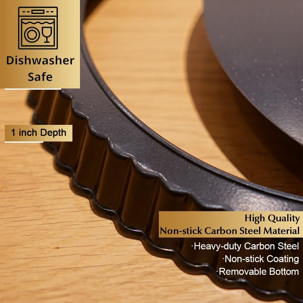 - 【Durable Material & Special Design】Made of heavy-duty carbon steel, the tart pan is sturdy, durable and rust-resistant. With removable bottom and PFOA free non-stick coating design, the bottom can be easily popped out from the pan and wont stick to the quiche tart. It is the best choice for families to make tarts or quiches.