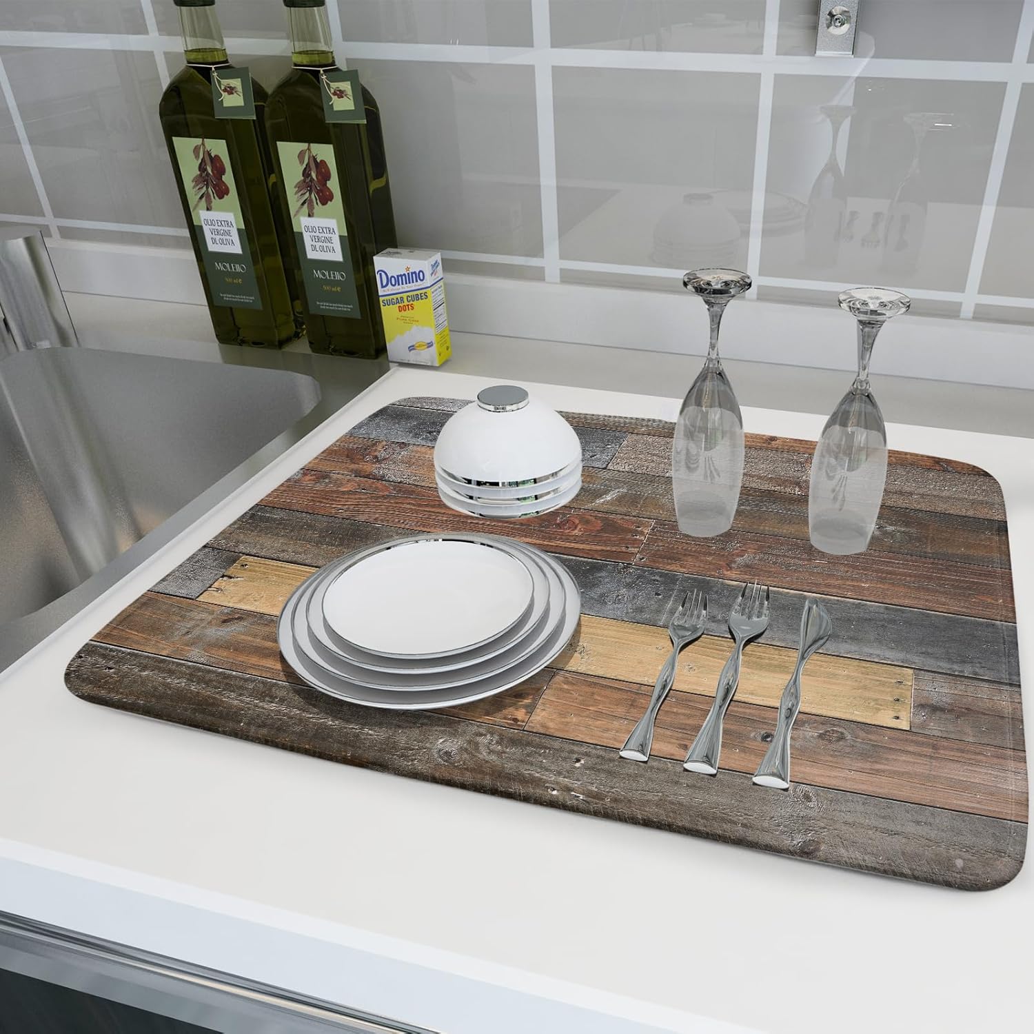 Giwawa Wood Grain Dish Drying Mat for Kitchen Countertop, Rustic Wooden Board Dish Drainer Mats, Vintage Country Style Barnwood Absorbent Reversible Microfiber Dish Drying Pad, 18x24 inch Large