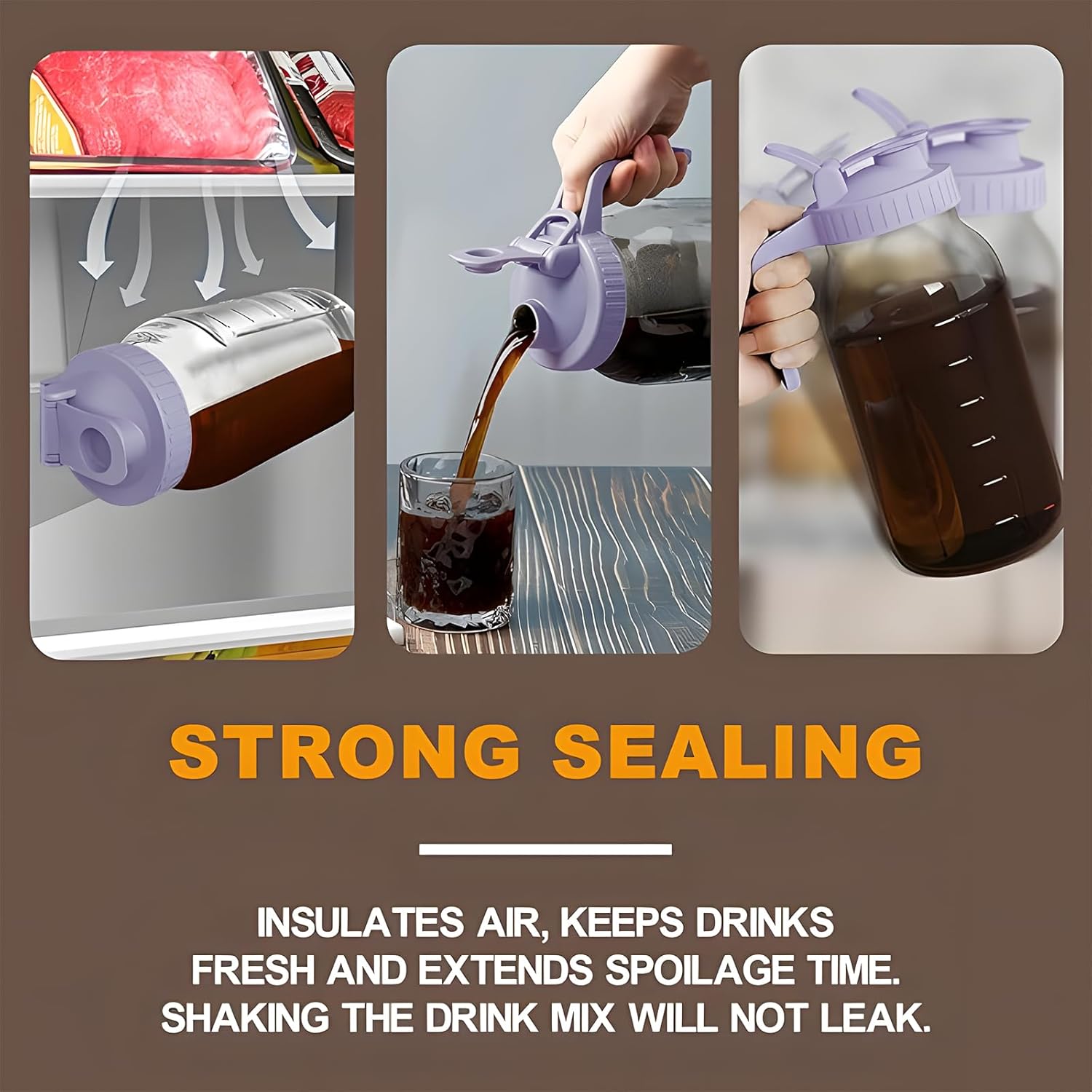 - 【Sturdy Sealing】 - Our liquid pitcher features a sturdy sealing system to keep your drinks fresh and prevent leakage. The leak-proof spout and sealing ring perfectly isolate the mason jar pour spout from the inside and outside, preventing food odors from affecting the taste. You can store your drinks with confidence, knowing that they will stay fresh and leak-free, even when the pitcher is lying down