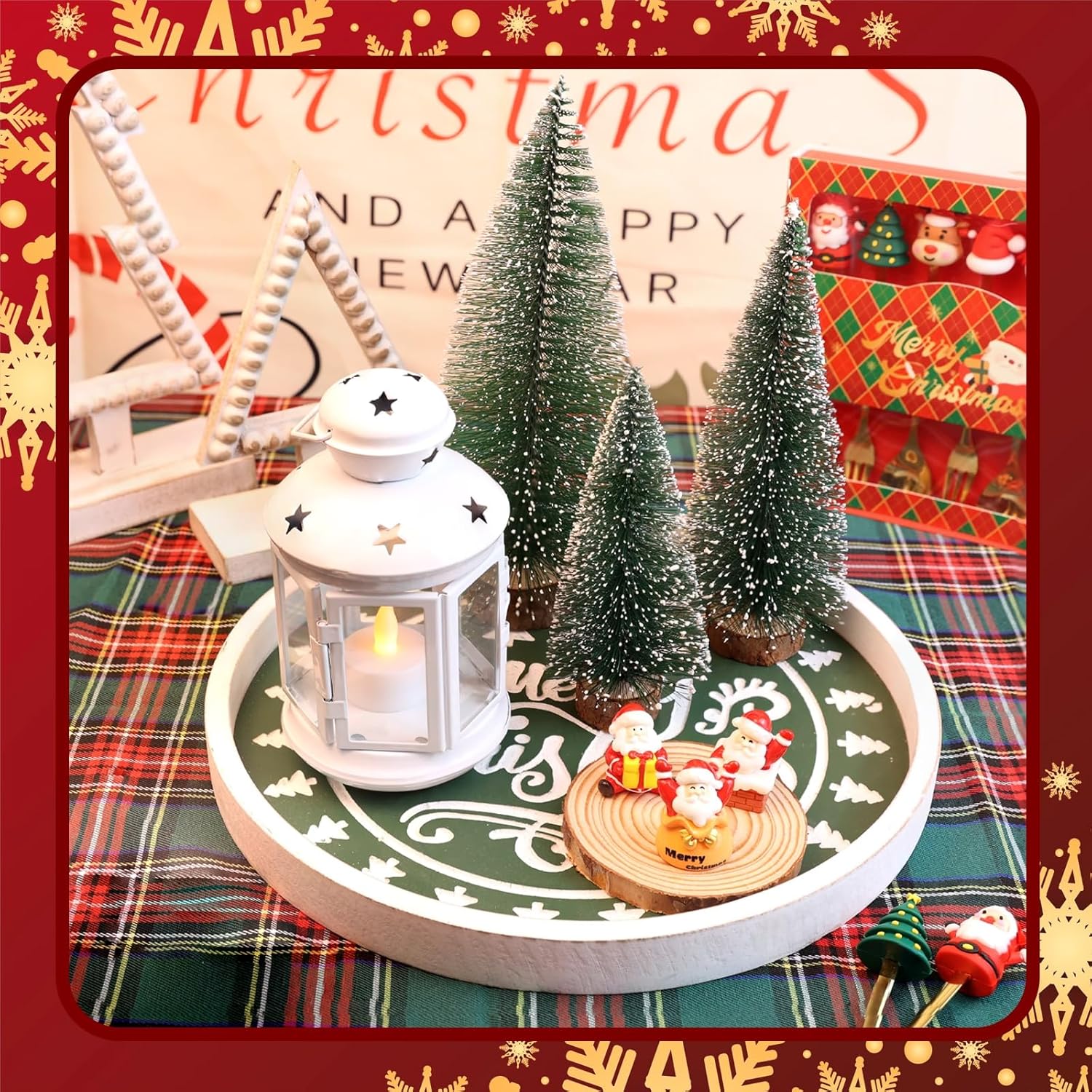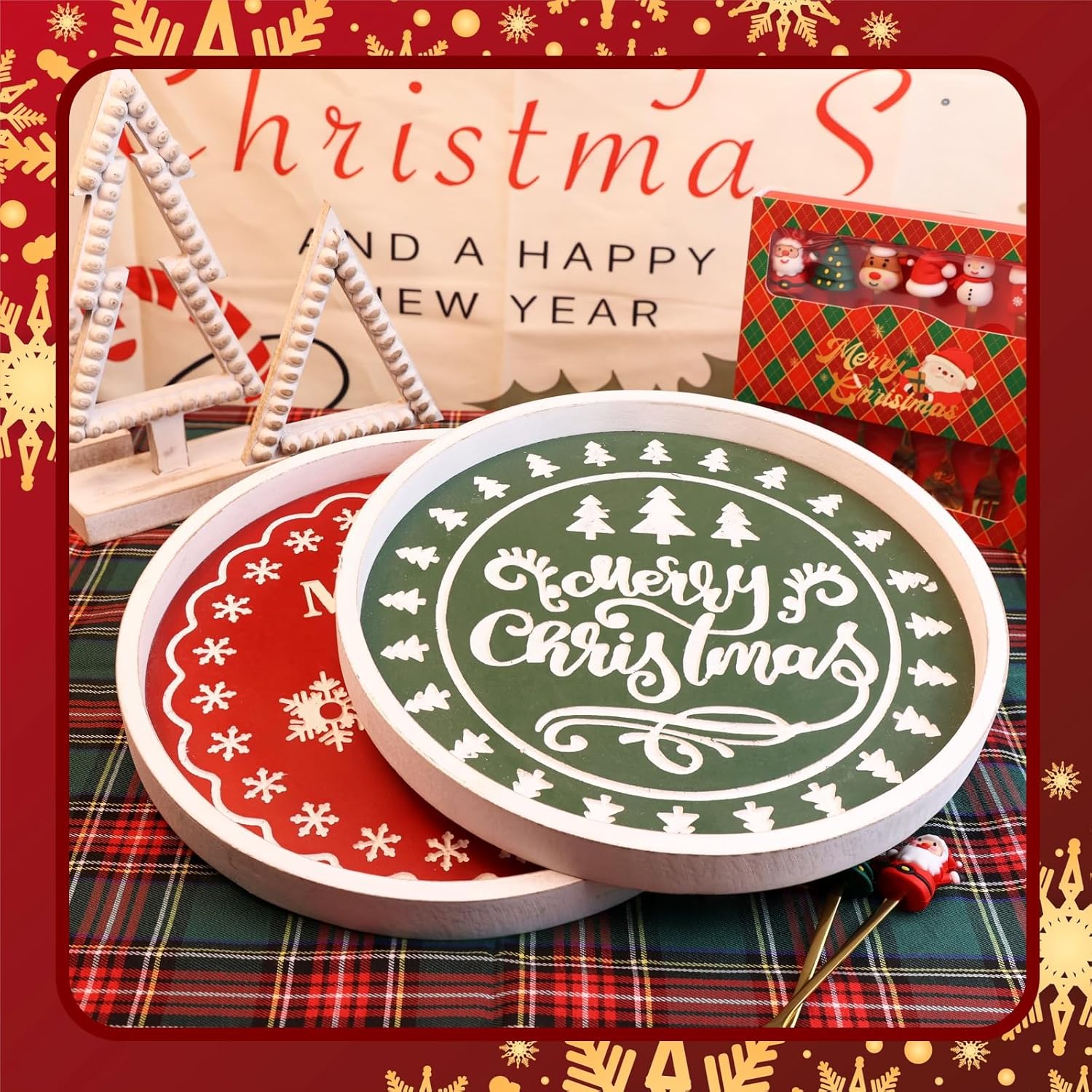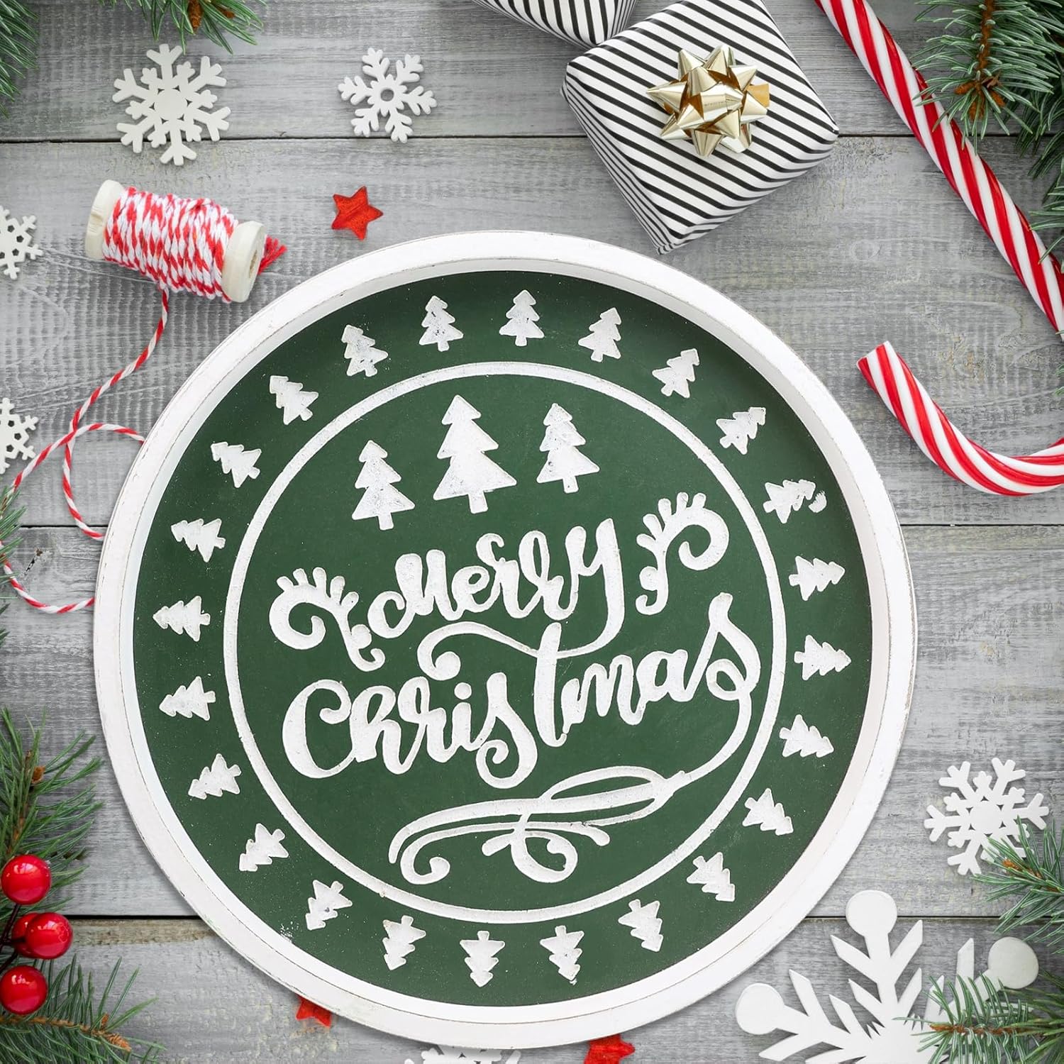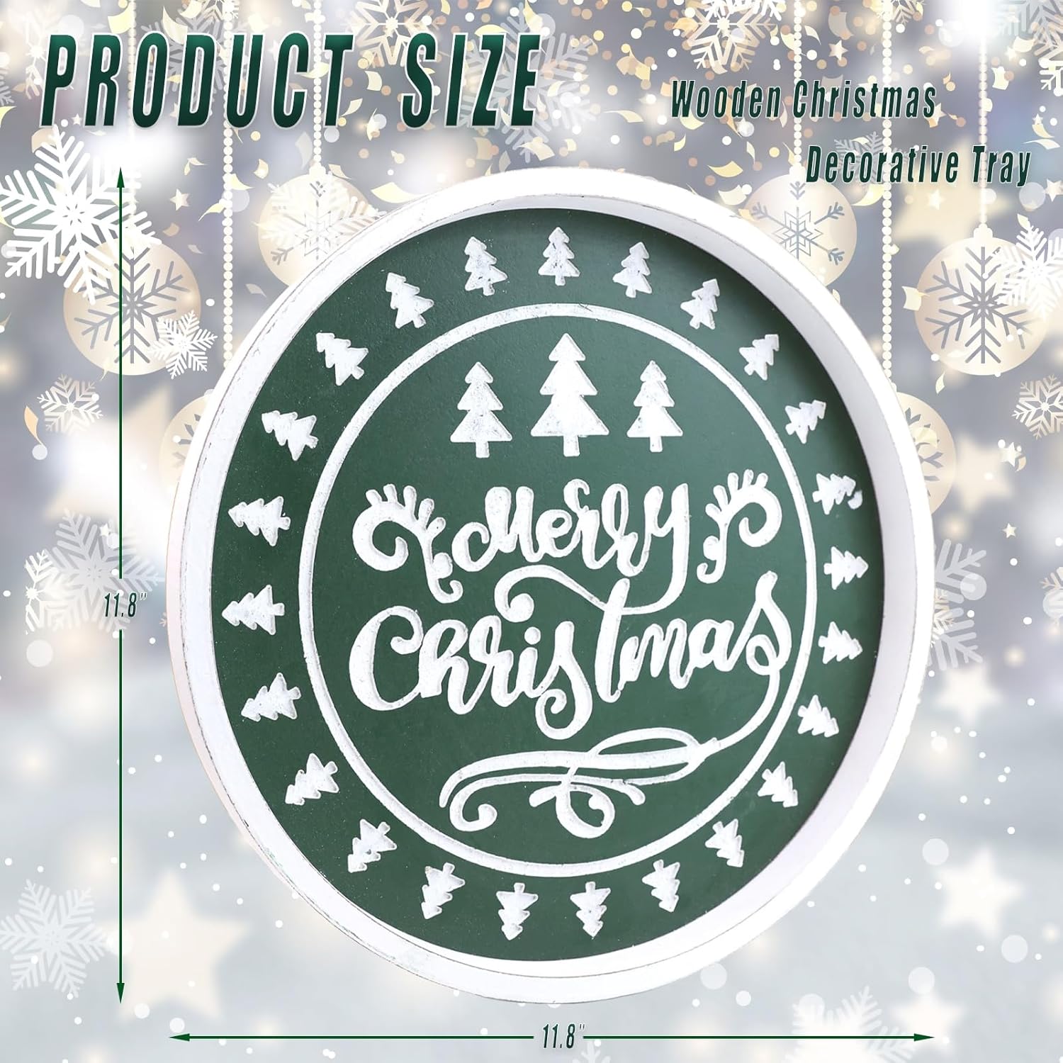 Christmas Wood Decorative Ottoman Tray for Coffee Table Kitchen Counter, Living Room, Round Handcrafted Green Wooden Serving Tray for Table Centerpiece
