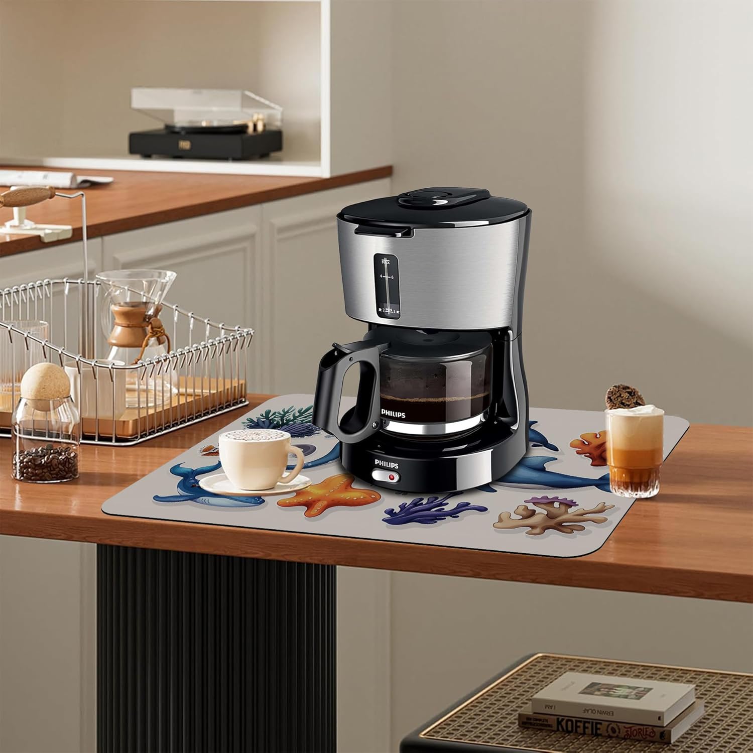 Sea Animals Dish Drying Mat Dolphins Starfish Anemones Kitchen Mat 12"x19" Bsorbent Coffee Maker Mat for Dishes,Utensils Coffee Maker Pots and Pans Easy Clean Dish Slip Resistant Pad