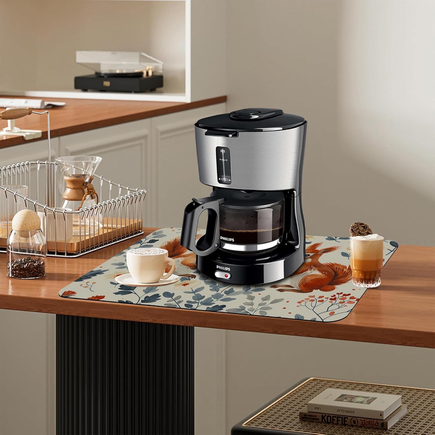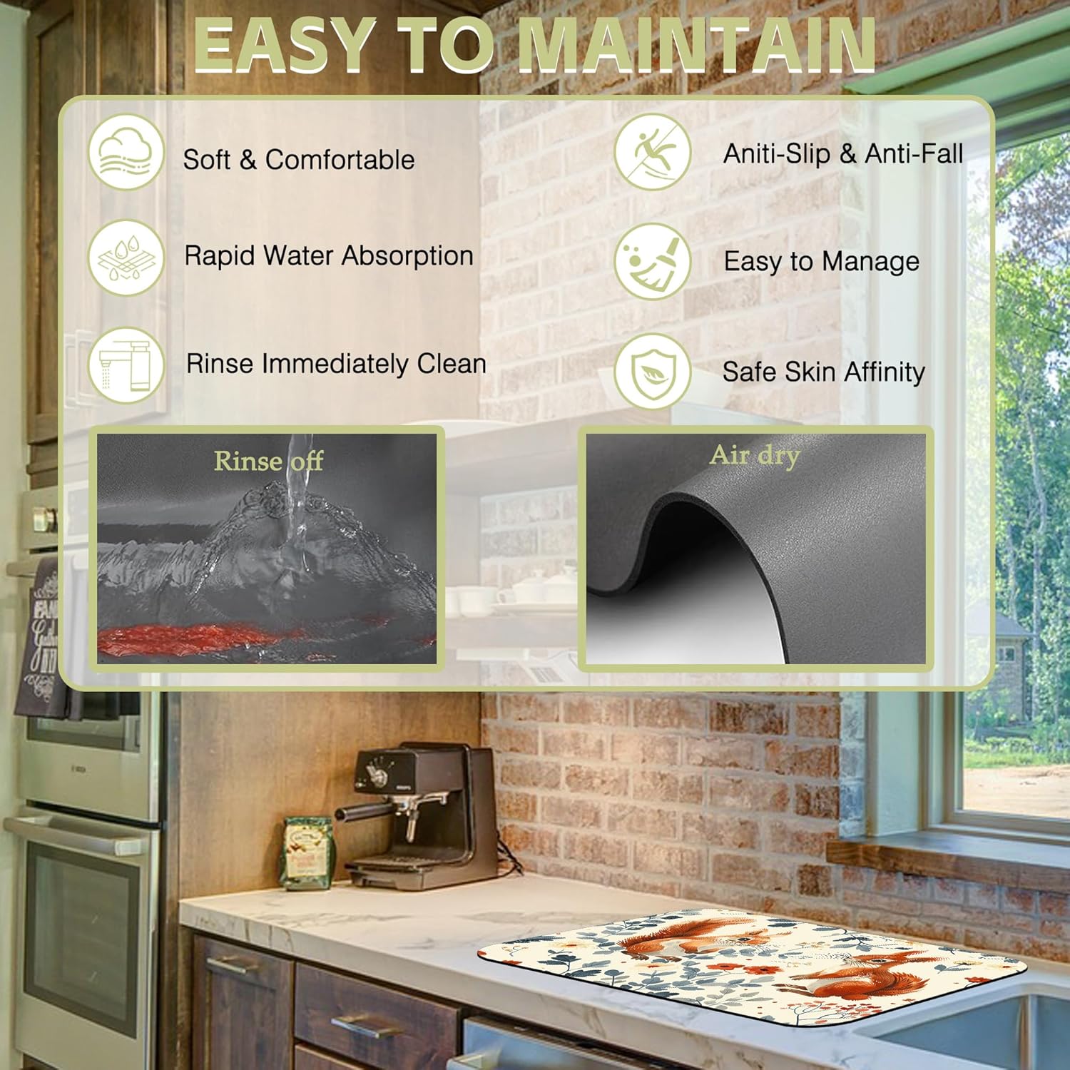 Dish Drying Mat Squirrel in the Flowers Kitchen Mat 12"x19" Bsorbent Coffee Maker Mat for Dishes,Utensils Coffee Maker Pots and Pans Easy Clean Dish Slip Resistant Pad