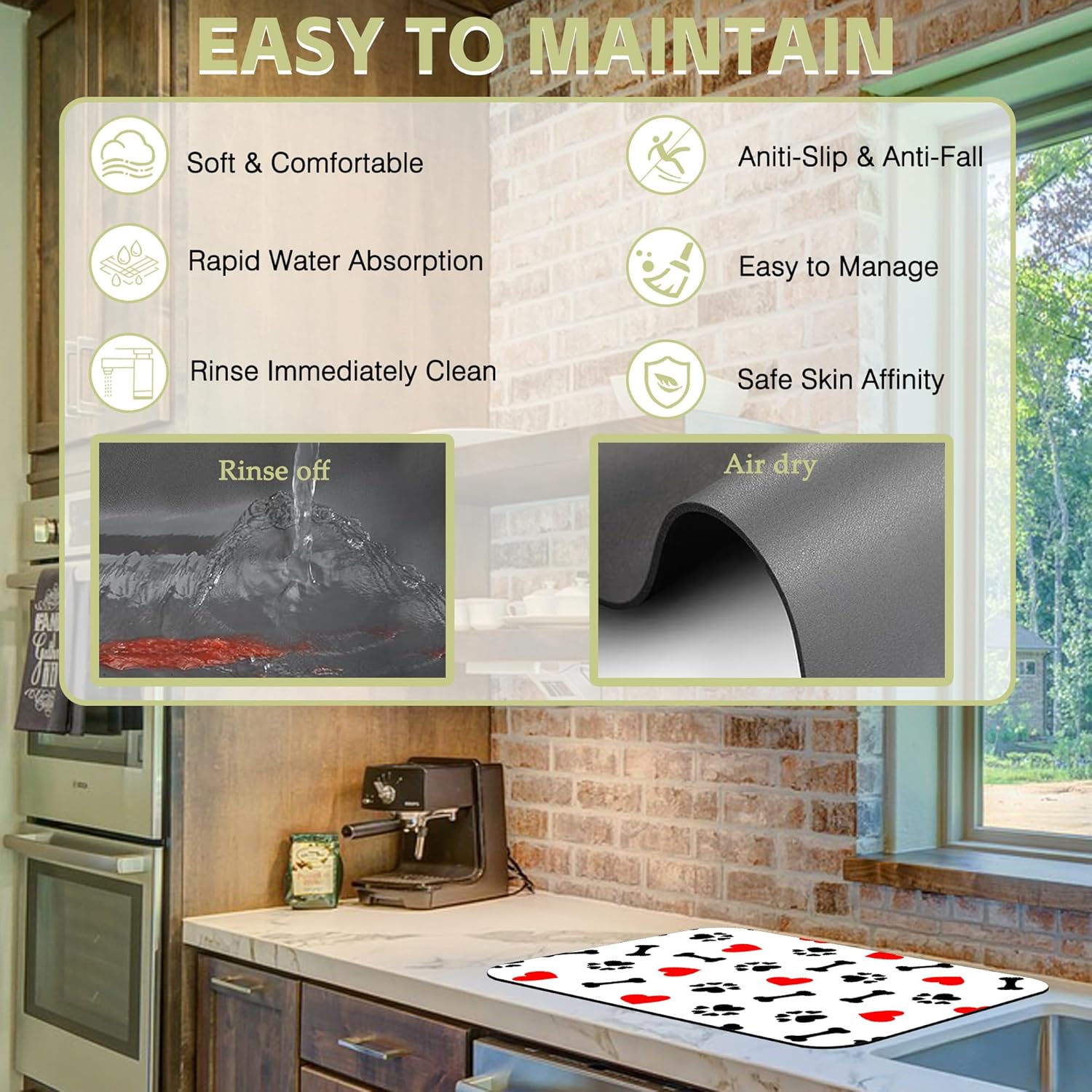 Dish Drying Mat Cute Dog Bone Paw Print Red Heart Kitchen Mat 16"x24" Bsorbent Coffee Maker Mat for Dishes,Utensils Coffee Maker Pots and Pans Easy Clean Dish Slip Resistant Pad