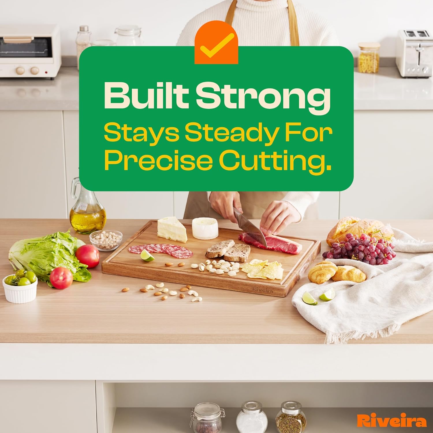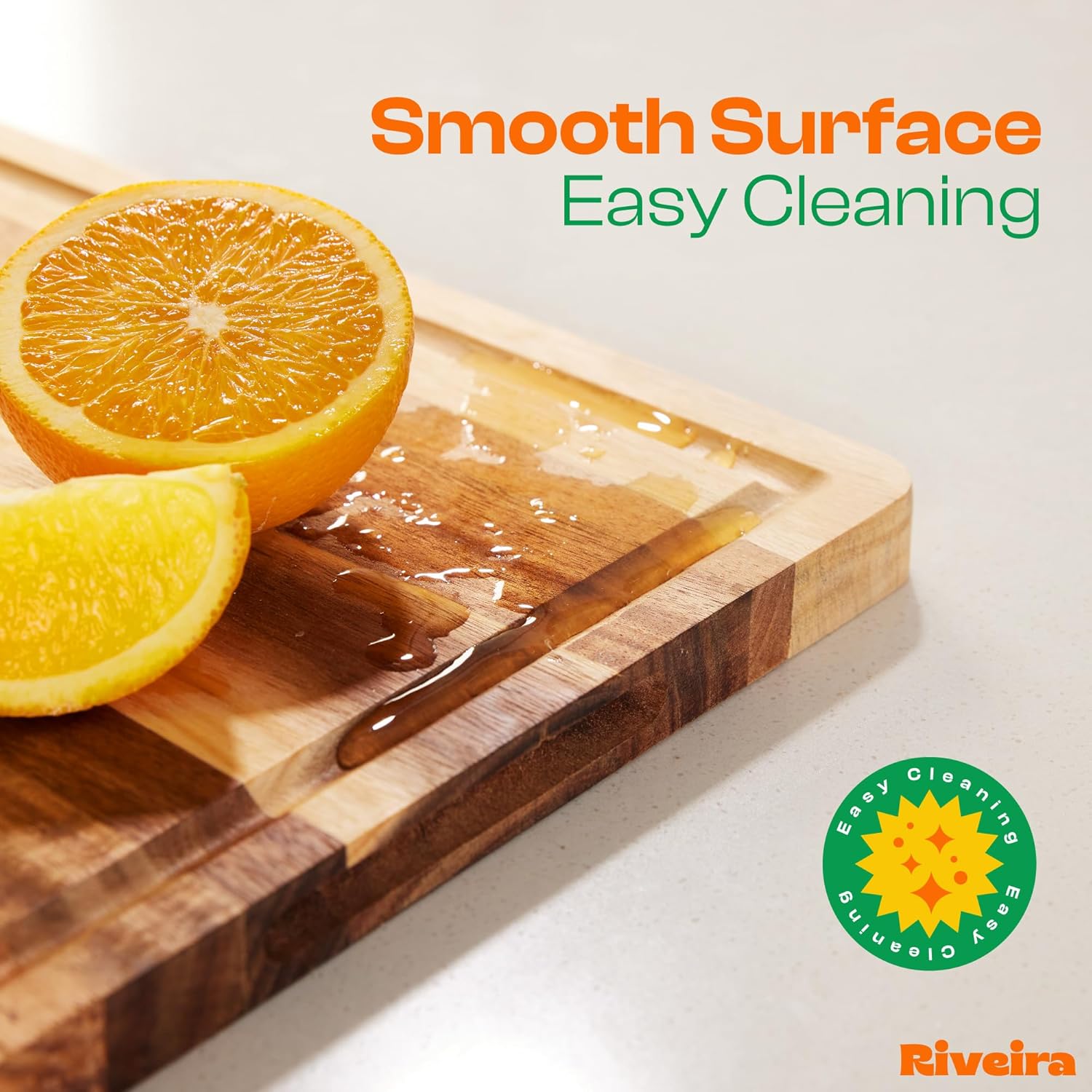 - Premium Crafted Acacia — Take a detour from traditional kitchen aesthetics with this acacia wood board crafted from 100% natural acacia. Beyond being an unconventional and eco-friendly choice, the chopping board wood proudly showcases the environment friendly and organic acacia. This wood cutting boards for kitchen counter adds an unexpected touch of confidence and style to your once-orderly culinary space. Riviera's wooden chopping boards for kitchen will be there for you for many years.