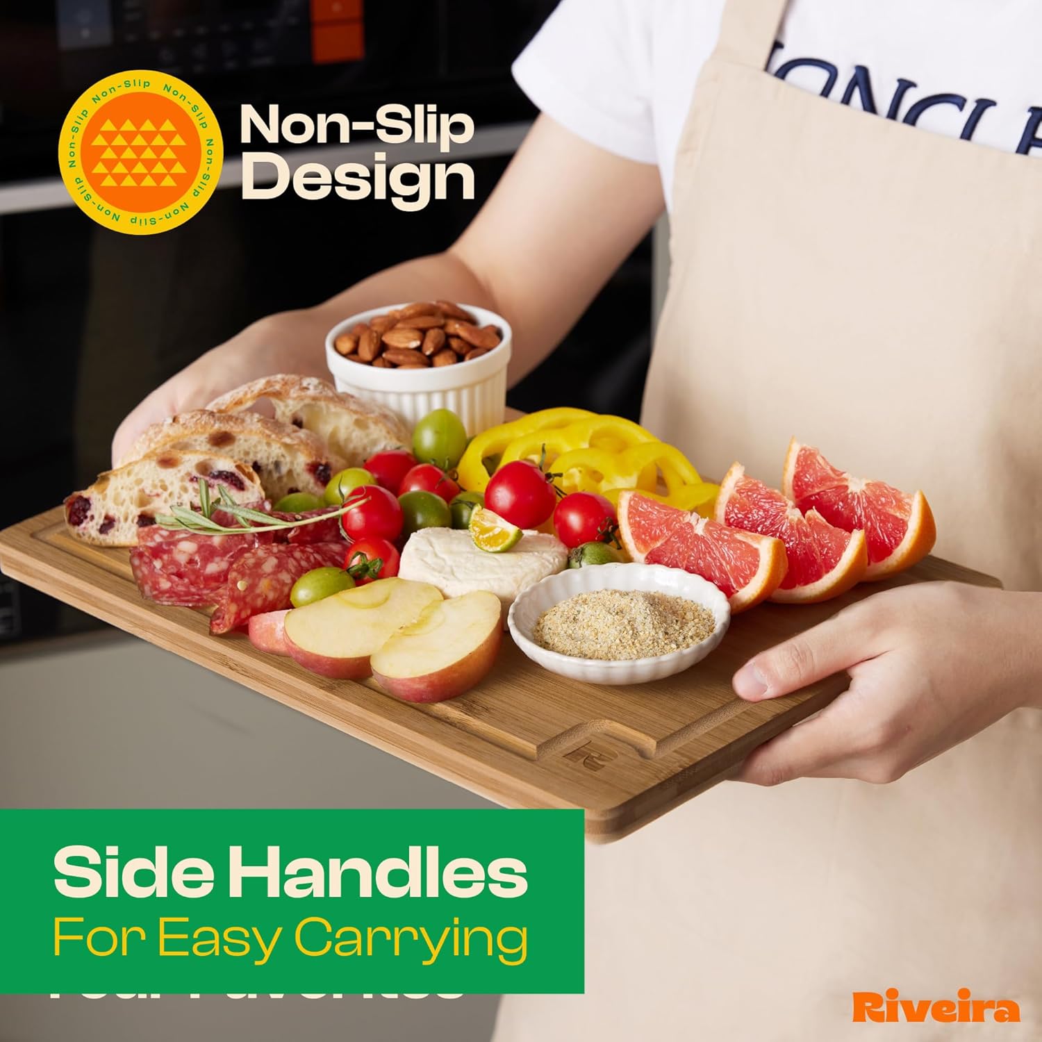 - Premium Crafted Bamboo — Take a detour from traditional kitchen aesthetics with this brown bamboo wood board crafted from 100% natural bamboo. Beyond being an unconventional and eco-friendly choice, the chopping board wood proudly showcases the environment friendly and organic bamboo. This wood cutting boards for kitchen counter adds an unexpected touch of confidence and style to your once-orderly culinary space. Riviera's wooden chopping boards for kitchen will be there for you.