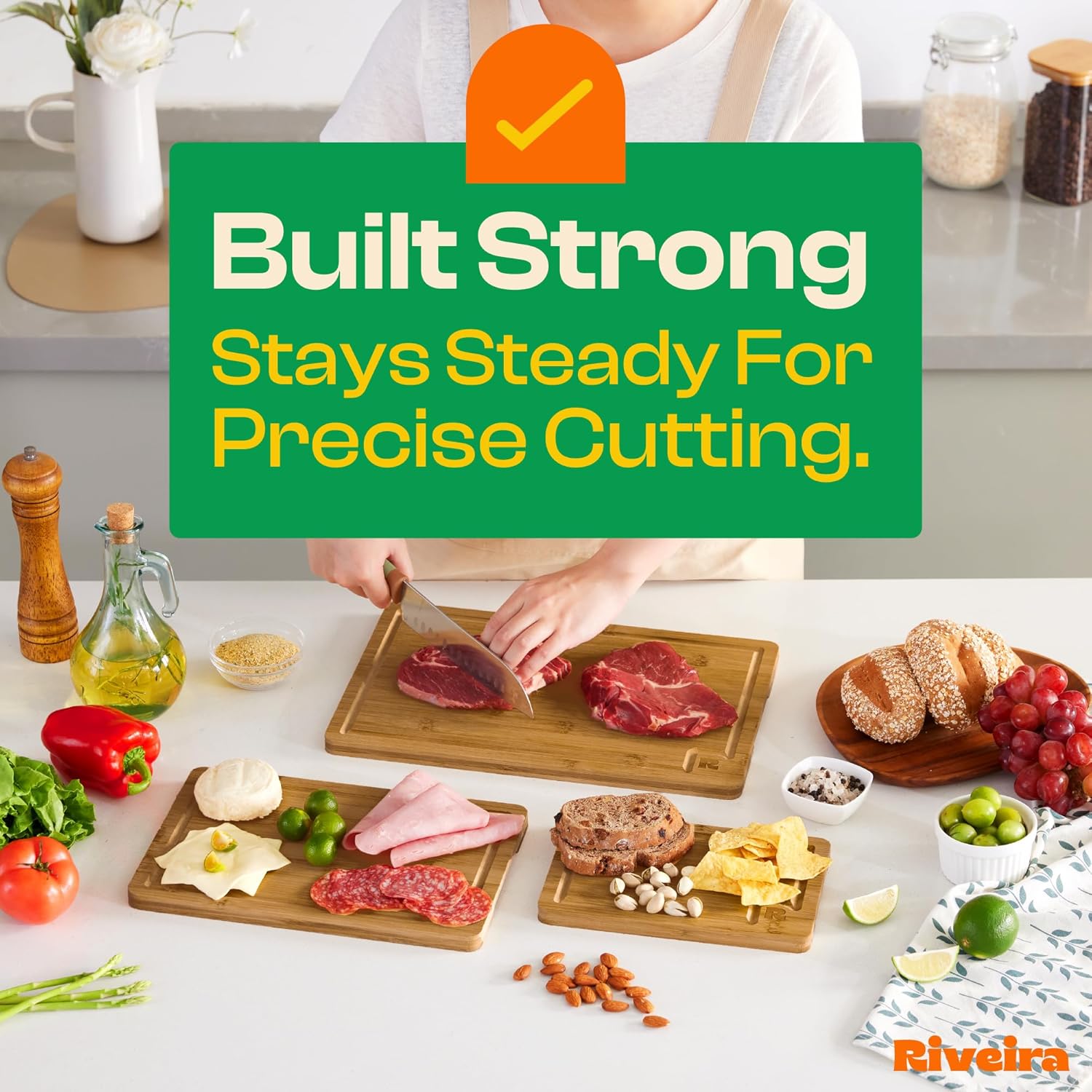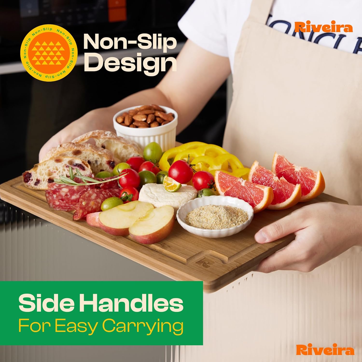 - Premium Crafted Bamboo — Take a detour from traditional kitchen aesthetics with this brown bamboo wood board crafted from 100% natural bamboo. Beyond being an unconventional and eco-friendly choice, the chopping board wood proudly showcases the environment friendly and organic bamboo. This wood cutting boards for kitchen counter adds an unexpected touch of confidence and style to your once-orderly culinary space. Riviera's wooden chopping boards for kitchen will be there for you.