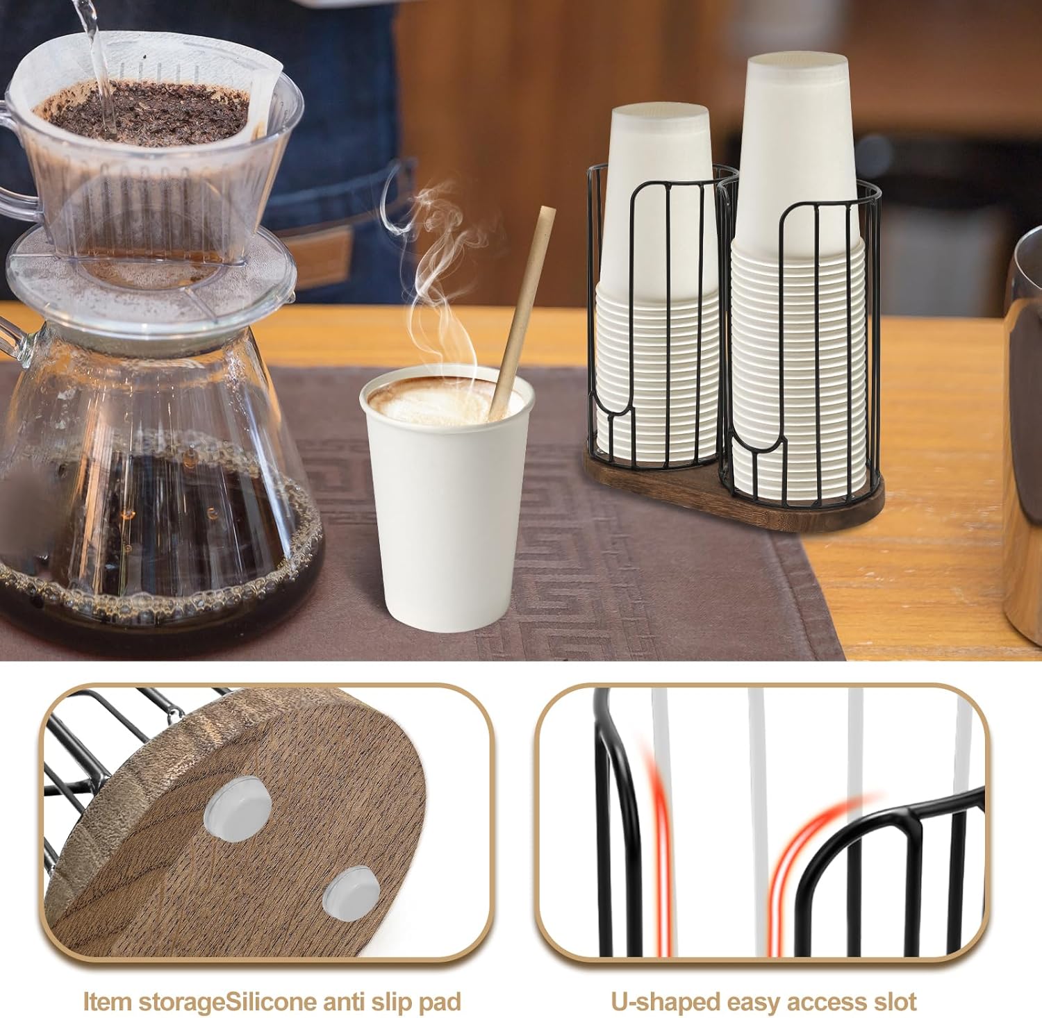 2-Compartment 18oz Coffee Cup Dispenser Rack with Wood Base, Disposable Cup, and Lid Organizer for Countertop - Perfect for Paper Cups, and Lid Organizer