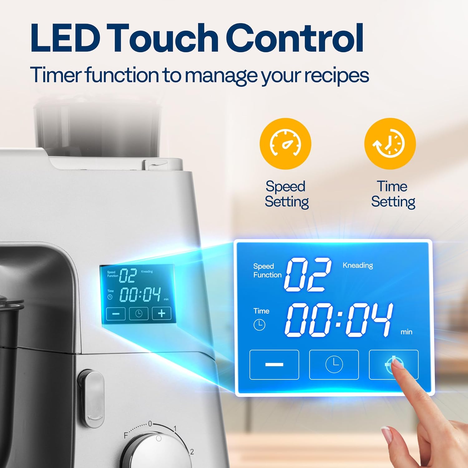 - USER-FRIENDLY DESIGN: The LED display with a built-in timer lets you control the speed and time with ease; The splash guard keeps your kitchen clean while adding ingredients; The tilt-head design allows for quick access to the bowl and attachments; The base includes suction cups to prevent movement on your countertop, ensuring stability during use; The overheat protection feature ensures safe operation, extending the mixer's lifespan