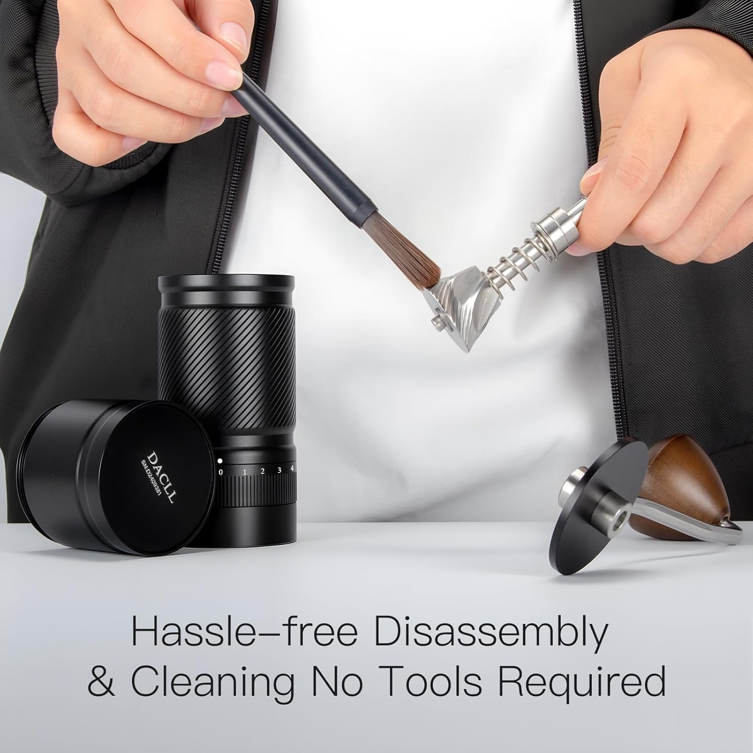 - Easy Cleaning and Disassembly Design: The all-metal integrated burr can be fully detached for easy disassembly and cleaning, allowing you to maintain the grinder effortlessly without the need for extra tools. Simply use the included cleaning brush (do not rinse with water) to keep the stainless steel coffee grinder free from residue, ensuring a fresh grind every time