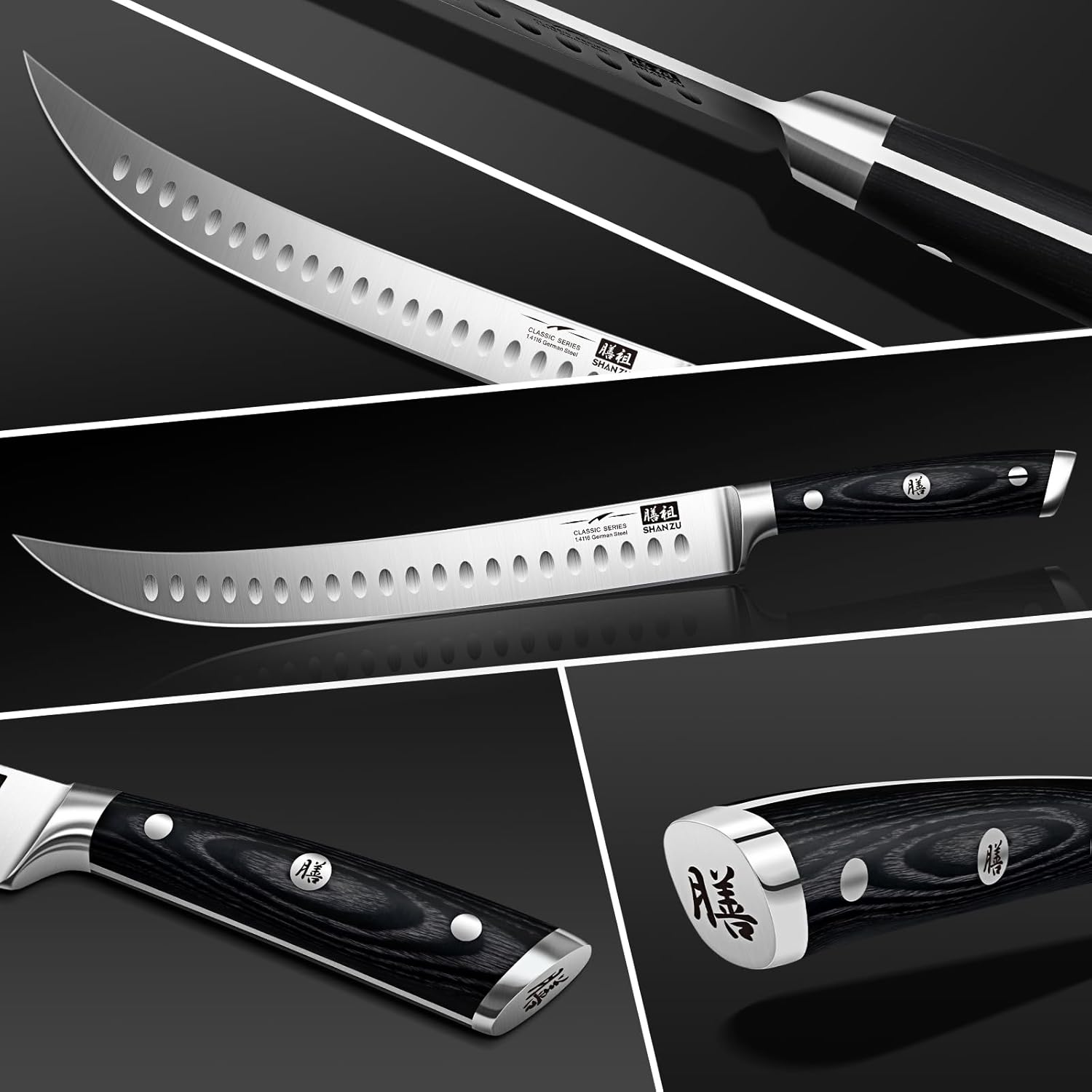 - 【High Efficiency Cutting Blade】Adopting a century-old forging process. This carving knife uses an ultra-thin double edged blade and adds a groove design to prevent food from sticking, which can effectively improve cutting efficiency