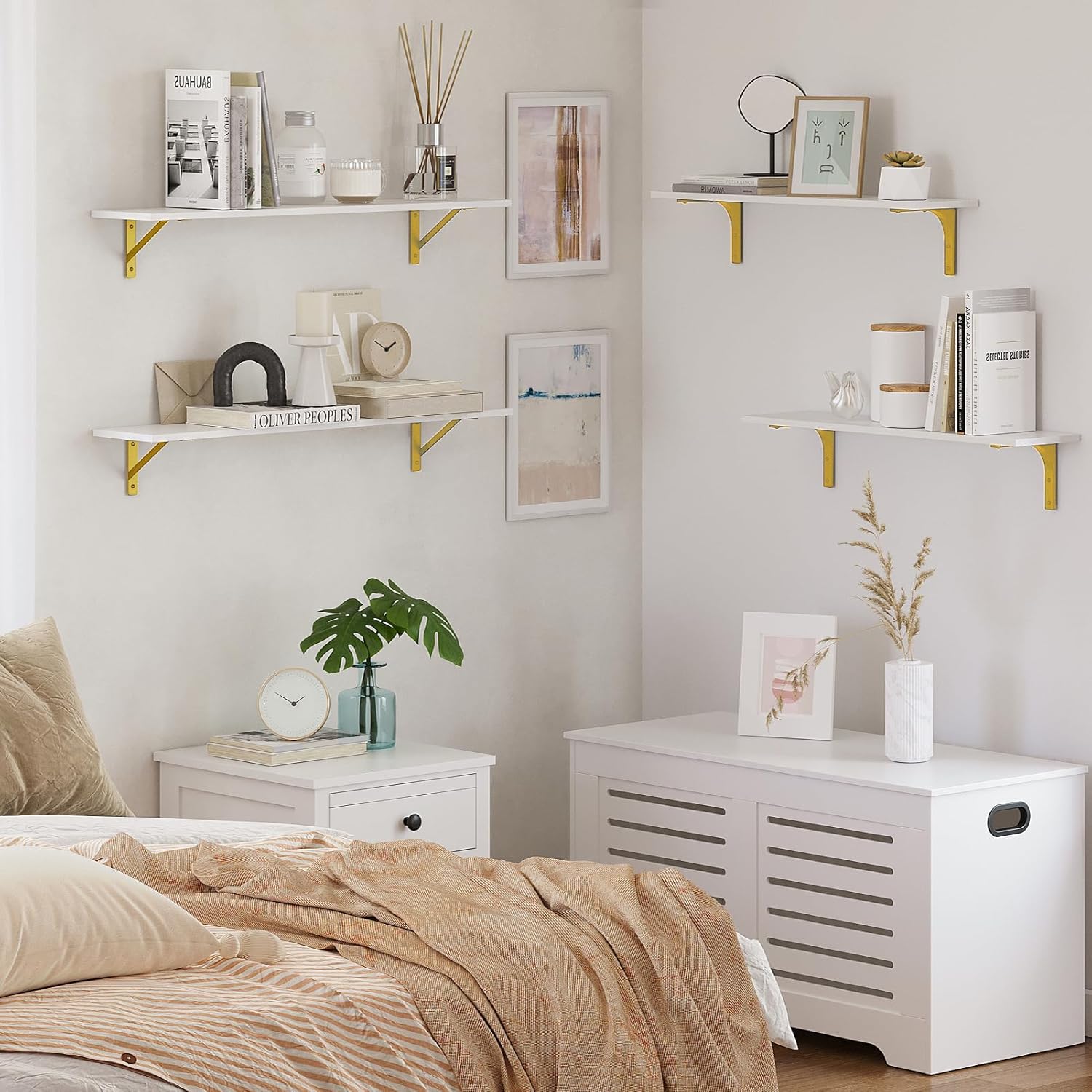 DINZI LVJ Long Wall Shelves, Set of 4, 31.5Inch Wall Mounted Shelves, Floating Shelves for Wall Storage with Metal Brackets, for Living Room, Bathroom, Bedroom, Kitchen, White and Gold