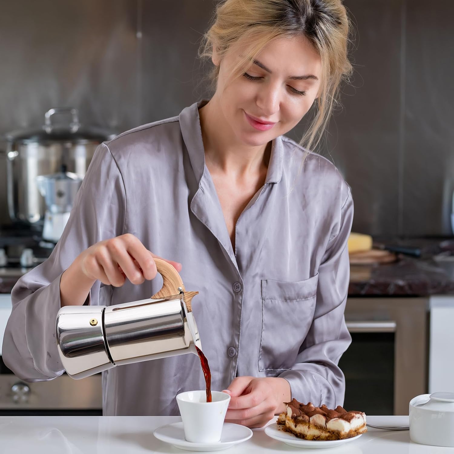 - Classic Design: Featuring a sleek, traditional moka pot design, this coffee maker adds a touch of elegance to your countertop.
