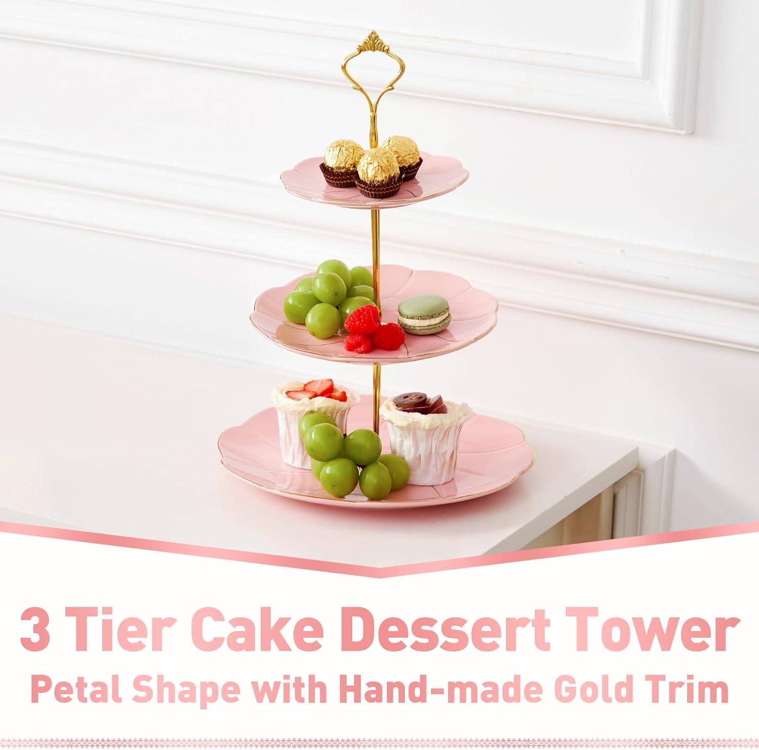 - 【3-Tier Luxury Porcelain Stand, Elevate Your Dessert Display】DUJUST 3-tier cake stand features pink porcelain plates with an elegant petal shape. Adorned with a delicate golden rim, it exudes luxury. Look at the top gold handle, it will remind you of a queen's crown, unique and exquisite. On this stand, you can show carefully prepared dessert snacks and cakes, and make your party perfect. Ideal for entertaining friends, this stand offers a refined way to savor life's sweet moments.