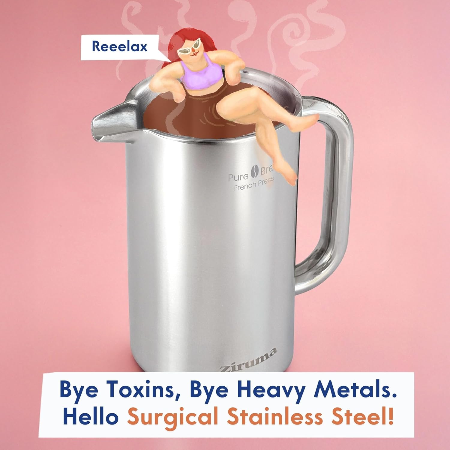 Ziruma Non-Toxic French Press, Surgical Stainless Steel Coffee Press, Plastic-Free, Heavy Metal-Free, No Endocrine Disruptors, 34 Oz, Double Wall, 4-Layer Filter, Portable Coffee Maker