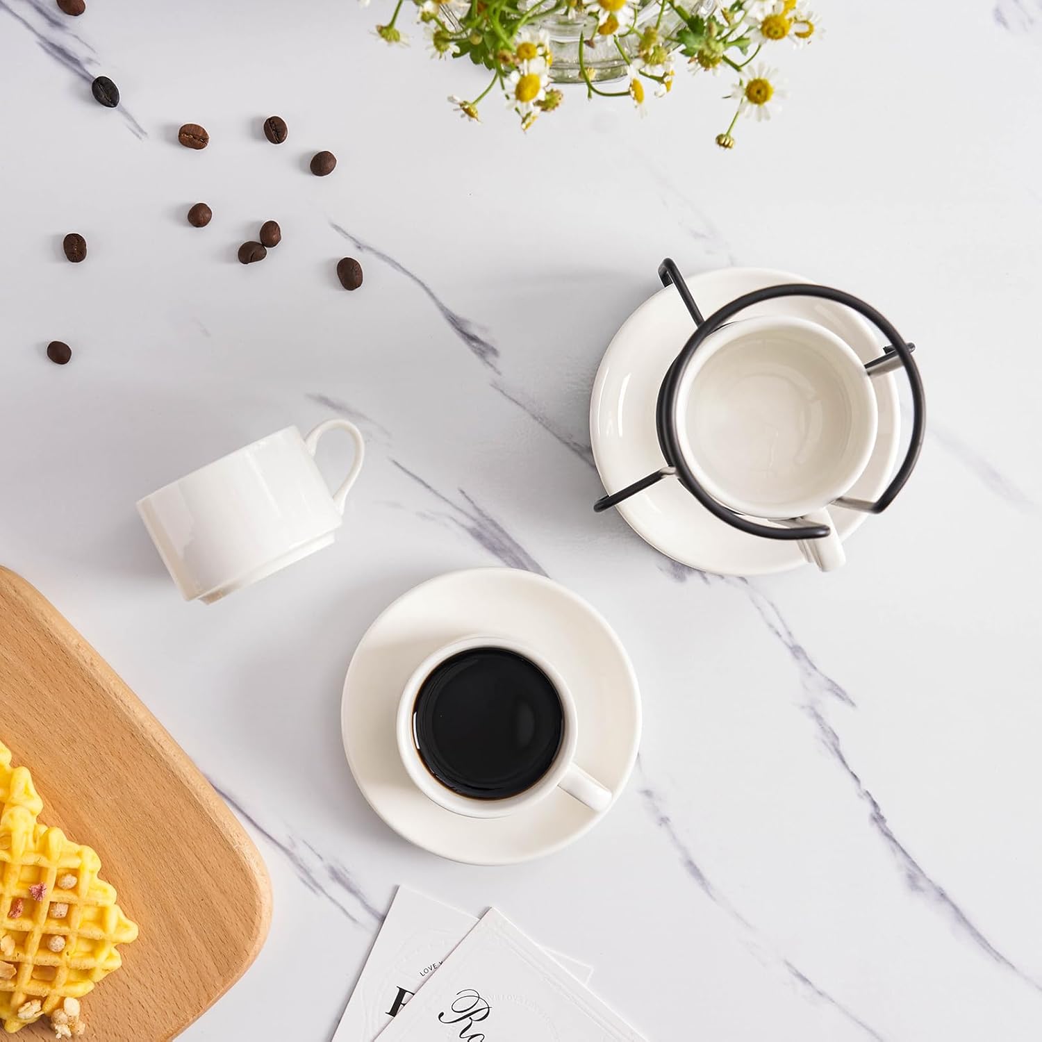 - 1. Elevate your kitchen experience with the MEICHU Espresso Cups Set. This set includes 4pcs 2.5 Ounce Espresso Cups with Saucers and Metal Stand, all in a classic ceramic white color. Perfect for people who enjoy coffee and conversation!