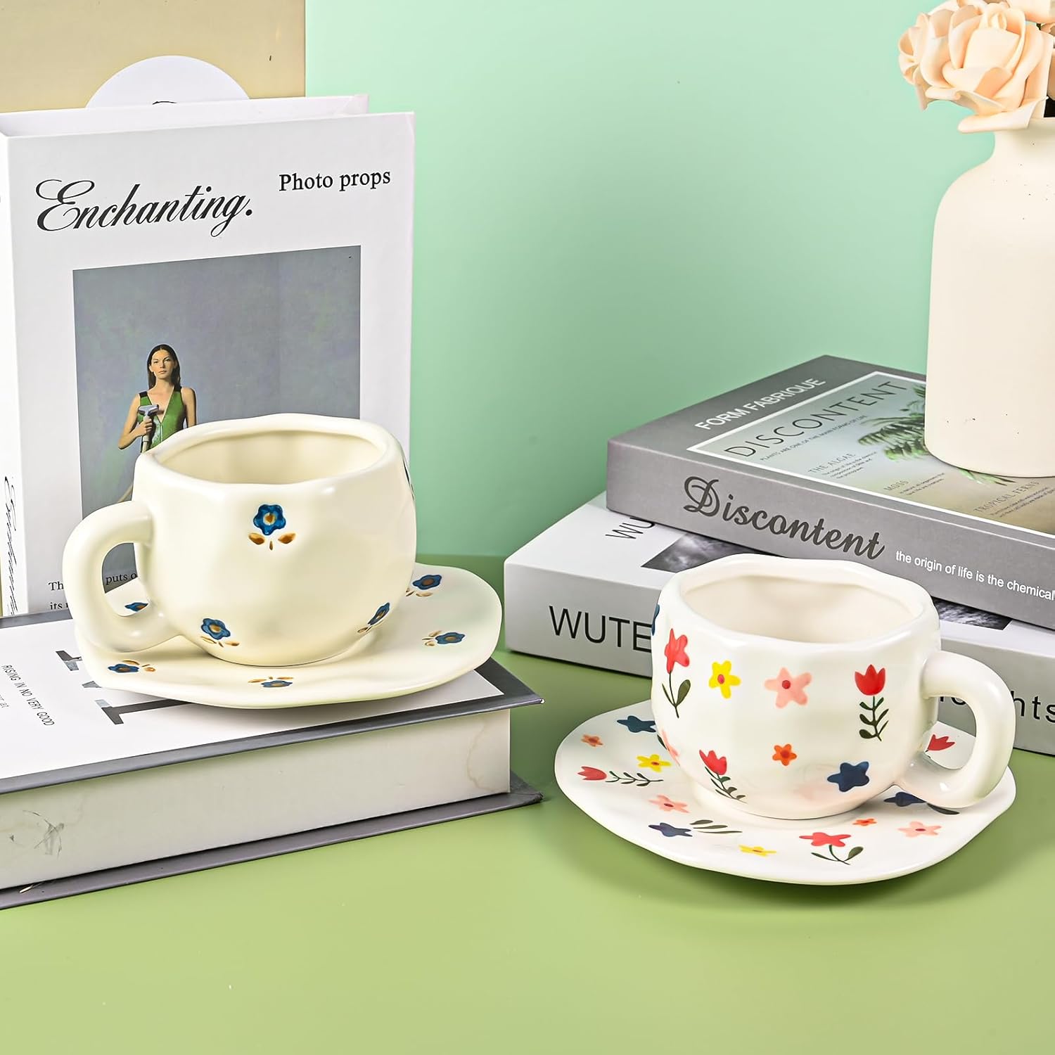Ceramic Coffee Mug Vintage Flower Mugs 8 oz Cute Floral Coffee Mugs Irregular Latte Art Cup Lead-free Porcelain Cups for Cappuccino, Cocoa (Blue and Pink Mug with Saucers)