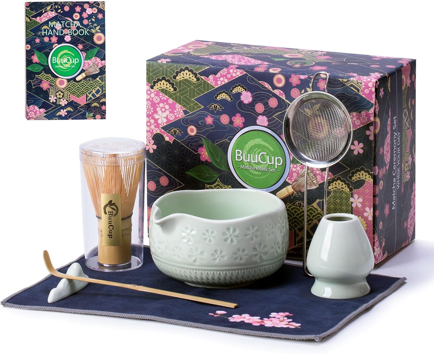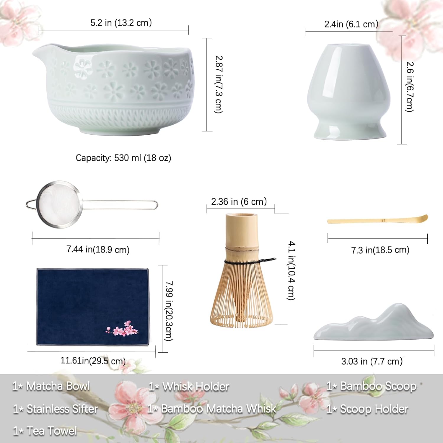 - Complete Matcha Kit: This matcha kit includes essentials for an authentic matcha experience: 1* Bamboo Matcha Whisk, 1* Bamboo Scoop, 1* Scoop Rest, 1* Stainless steel sifter, 1* 530 ml/18 oz Ceramic Matcha Bowl (Chawan), 1* Whisk Holder, 1* Cherry blossoms Tea Towel and 1* Hand book. Each tool is crafted with precision, designed to make your matcha lifestyle effortlessly stylish.