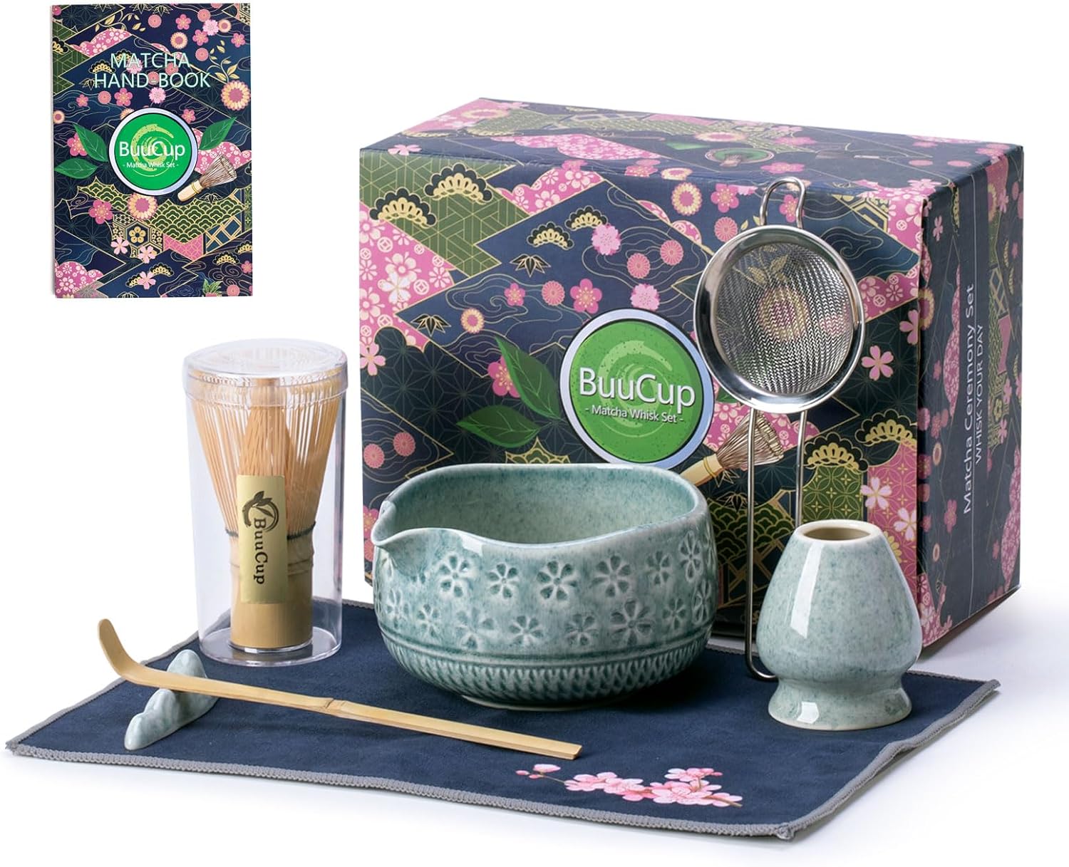 - Complete Matcha Kit: This matcha kit includes essentials for an authentic matcha experience: 1* Bamboo Matcha Whisk, 1* Bamboo Scoop, 1* Scoop Rest, 1* Stainless steel sifter, 1* 530 ml/18 oz Ceramic Matcha Bowl (Chawan), 1* Whisk Holder, 1* Cherry blossoms Tea Towel and 1* Hand book. Each tool is crafted with precision, designed to make your matcha lifestyle effortlessly stylish.