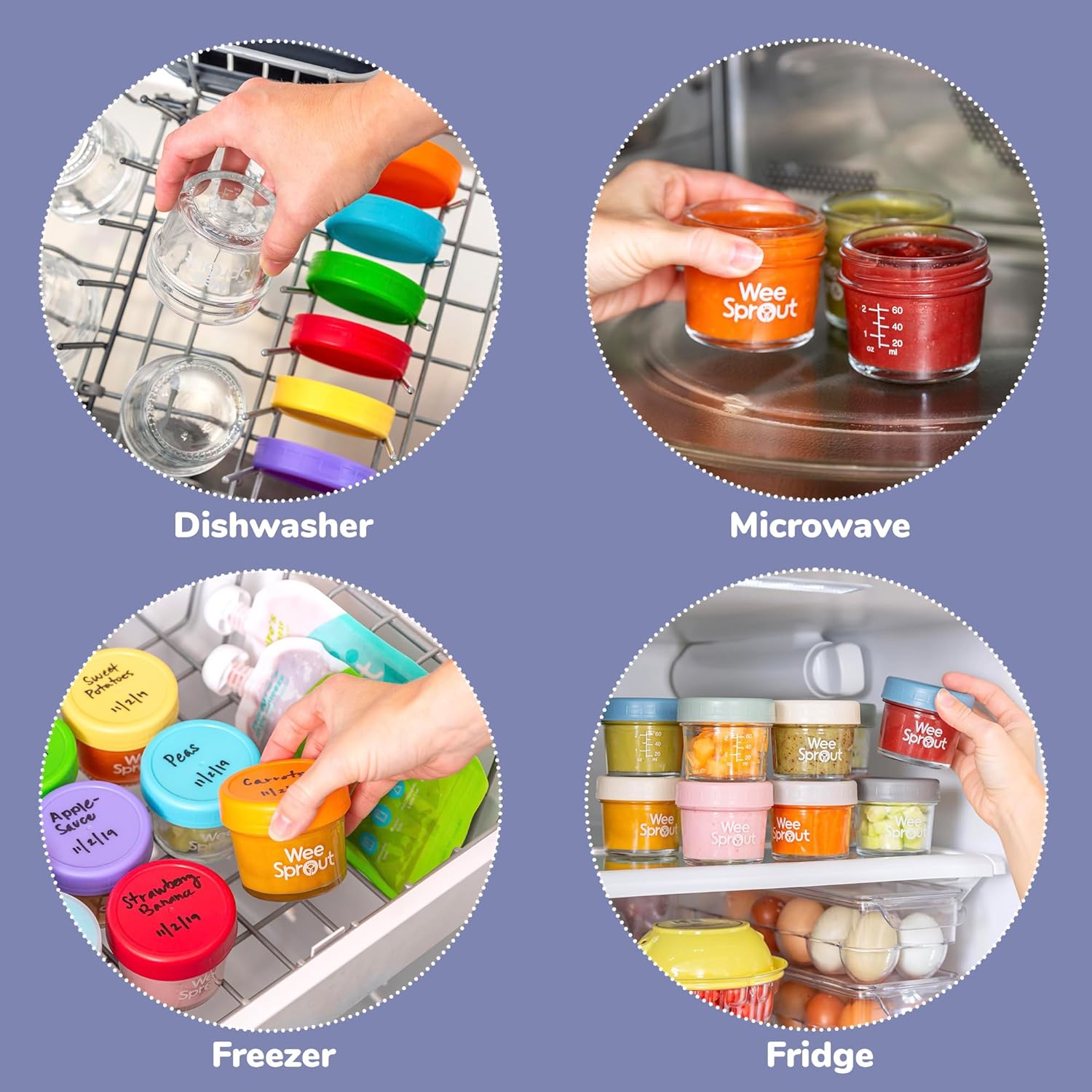 WeeSprout Glass Baby Food Storage Jars w/Lids (4 oz, 6 Pack Set) Snack, Puree, Reusable Small Containers, Breast Milk, Fridge or Freezer, Microwave & Dishwasher Safe, Essential Must Have for Infants
