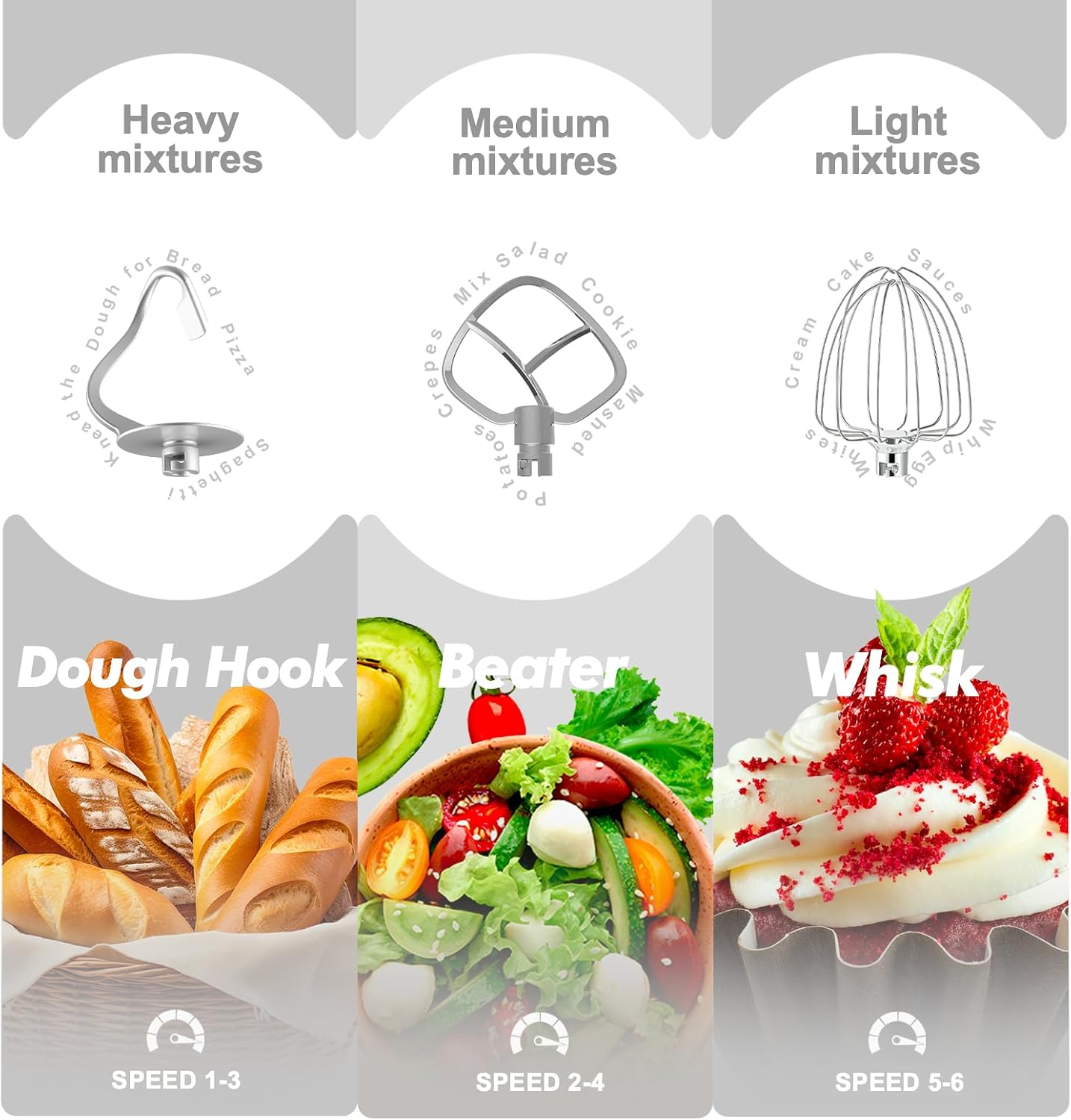 - Multiple Accessories: This electric mixer is fully equipped with accessories, including a dough hook; beater; wire whip,upgraded metal accessories can be directly loaded into the dishwasher,and has a splash-proof cover for the filling port to keep the kitchen clean