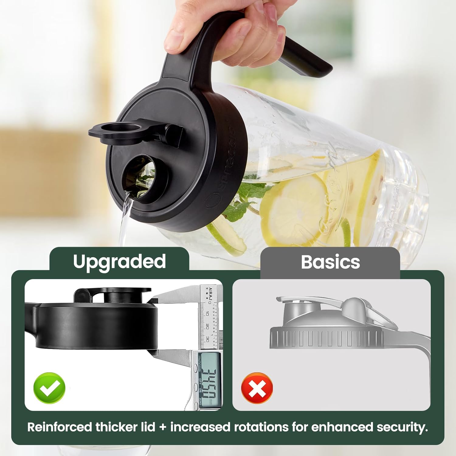 - Effortless Pouring Glass Pitcher with Lid: Enjoy effortless pouring with the 2.8 inches wide-mouth flip-cap spout and non-slip handle. Say goodbye to unwanted spills and mishaps, as our lid pops open to ensure your content won't leak or spill.