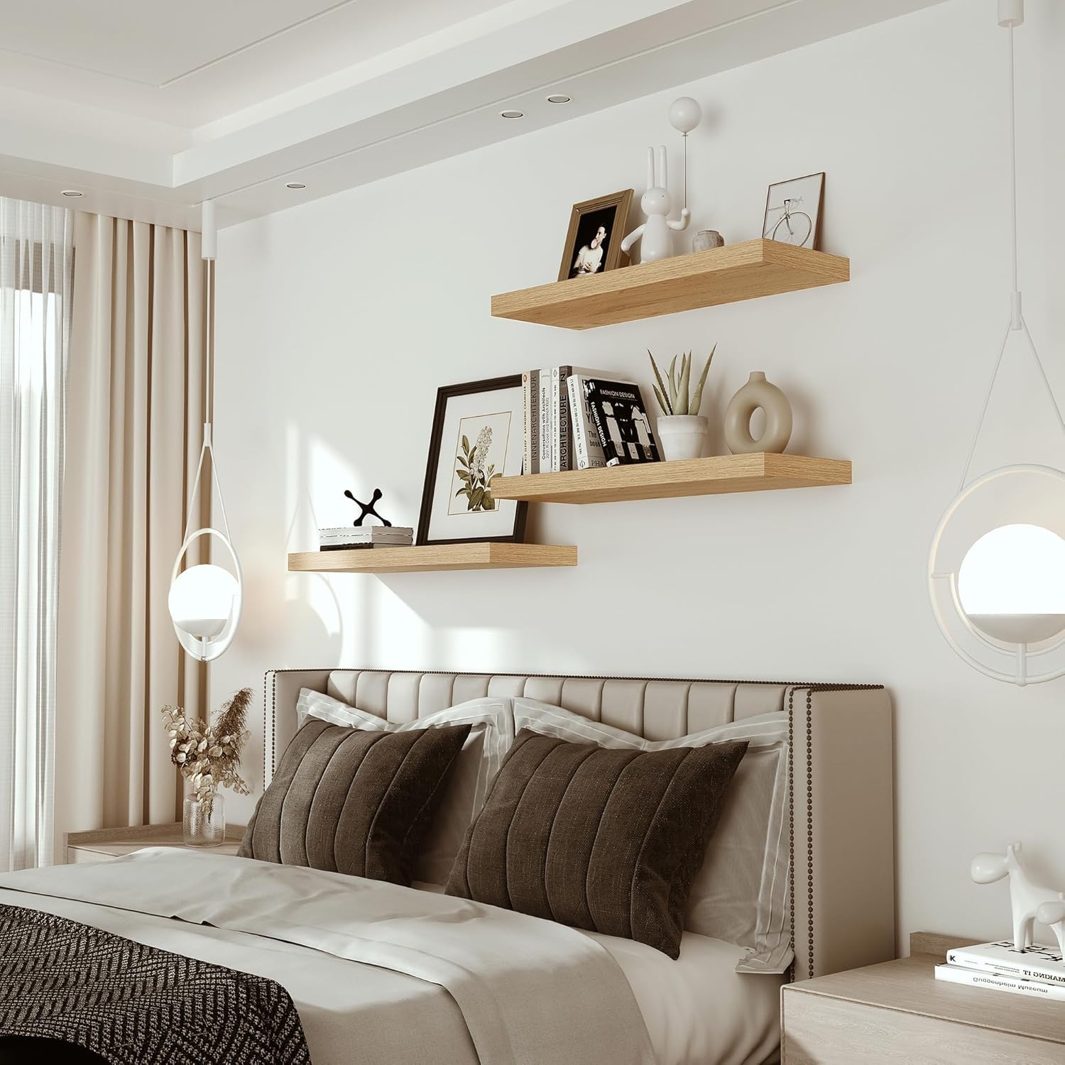 Vivelove Bathroom Floating Shelves for Wall 24 inchs Long, 9.2” deep x 1.6” Wall Shelf for Bedroom, Living Room, Kitchen, Office Home Decor, Deep Wood Shelves with Invisible Brackets, Set of 2, Oak