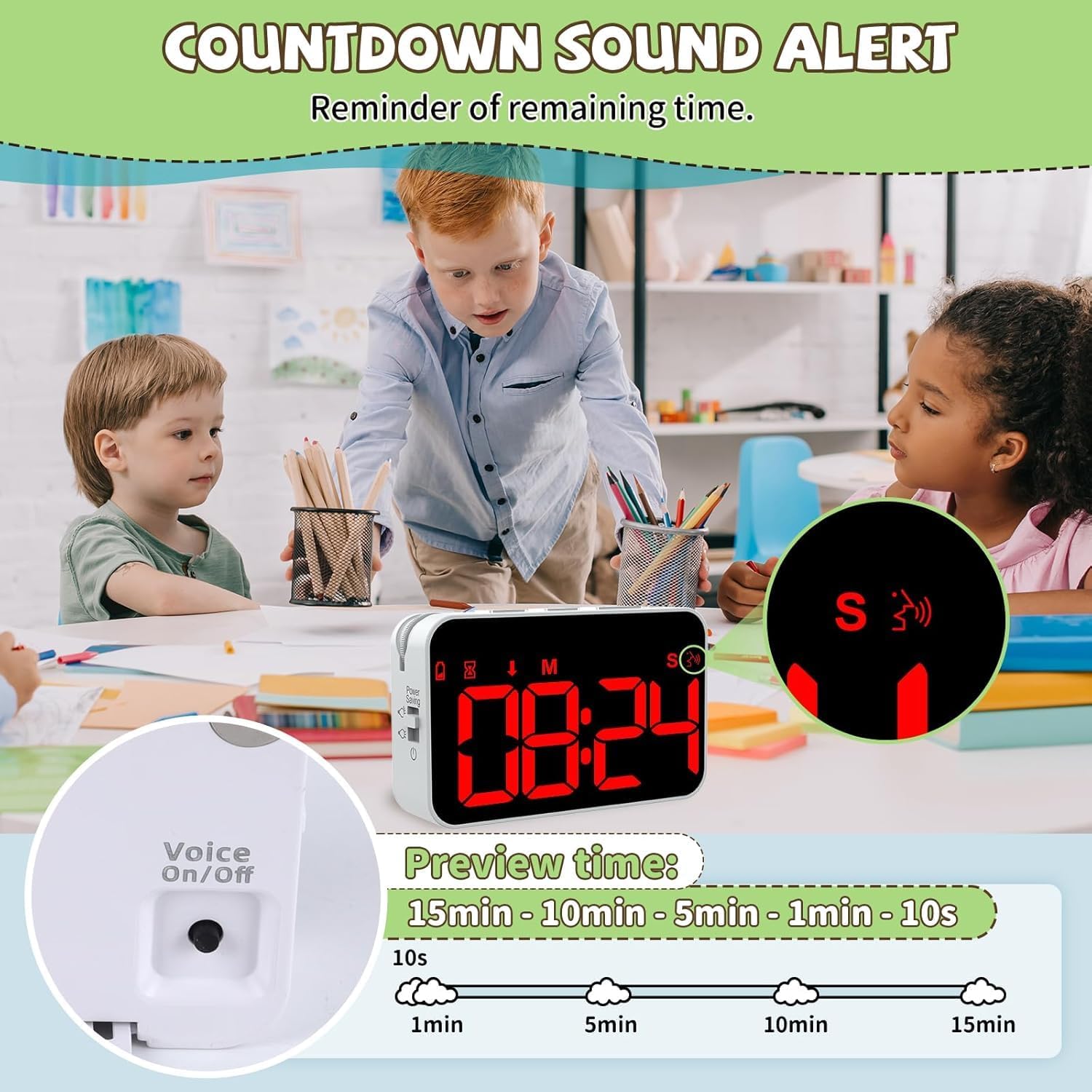 - Countdown Sound Alert function: This timer will sound an audible reminder at 15 min, 10 min, 5 min, 1 min and the last 10 s. This ensures that you don't miss important moments, helping you to better manage your time, allocate your energy and resources more efficiently, and improve your overall productivity. Of course, you can also turn this feature off.