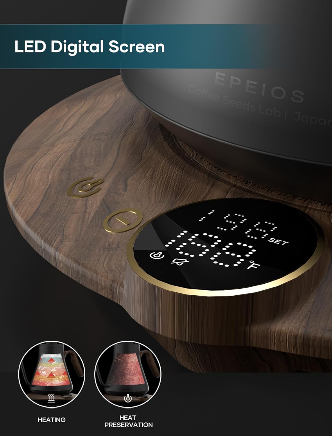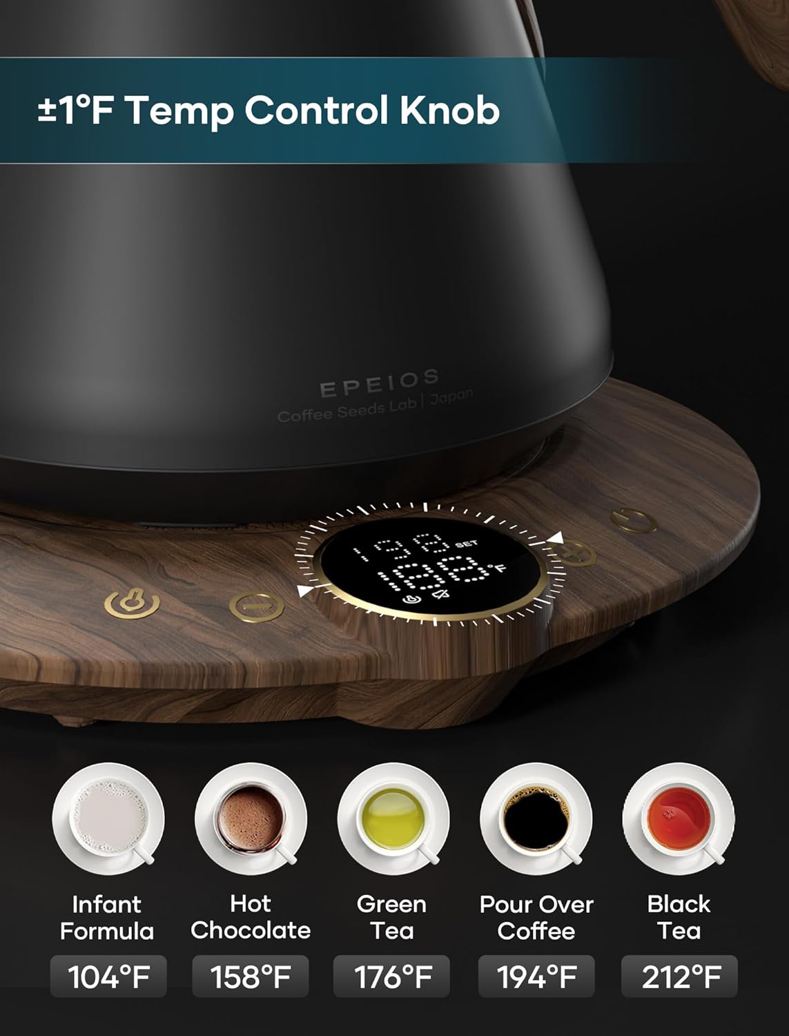- ±1℉ Temperature Accuracy - The intelligent base's built-in temperature control program. The program will adjust the heating power when the water temp approaches the desired temp according the temp probe detects the temp change.