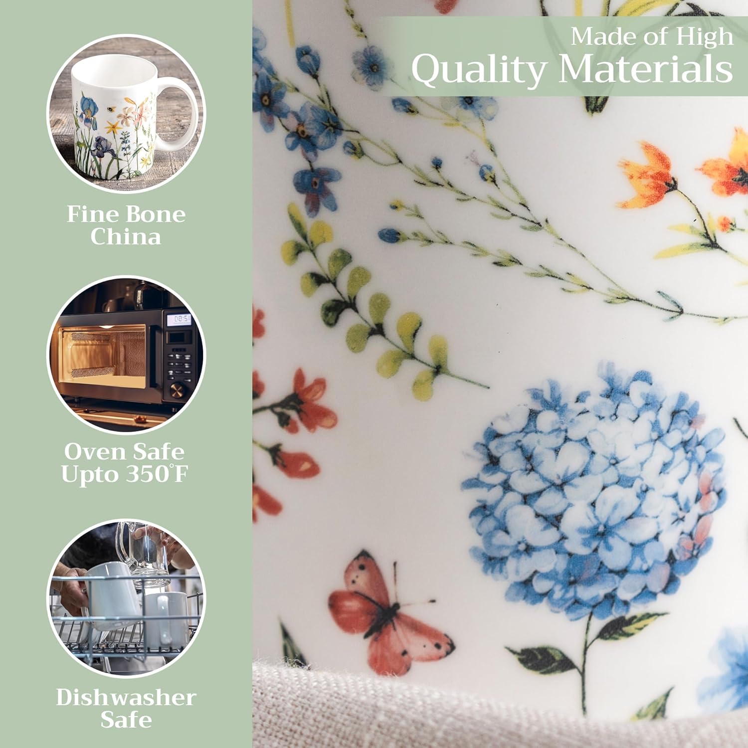 - Easy Care & Maintenance: Microwave, dishwasher, and oven safe up to 350°F. These bone china mugs are built for convenience and durability, making cleanup and reheating simple without compromising on quality