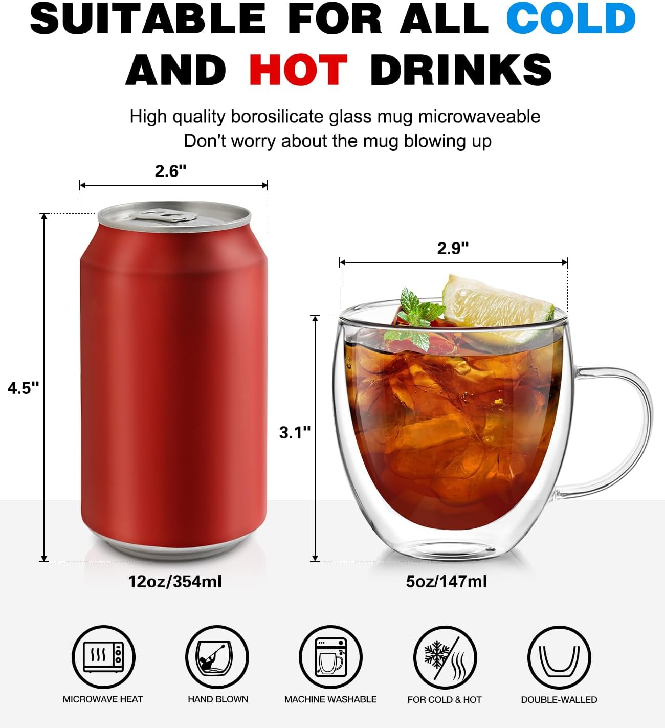 - HIGH QUALITY MATERIAL: Double glass coffee mugs blown from high temperature, condensation resistant borosilicate glass. It is an ideal drinking utensil at present. Stronger and more durable than ordinary glass, smooth and crystal clear surface. Easy to clean and microwaveable. At the same time, borosilicate glass is much lighter than ceramic, Ideal for elderly or children with weak wrists