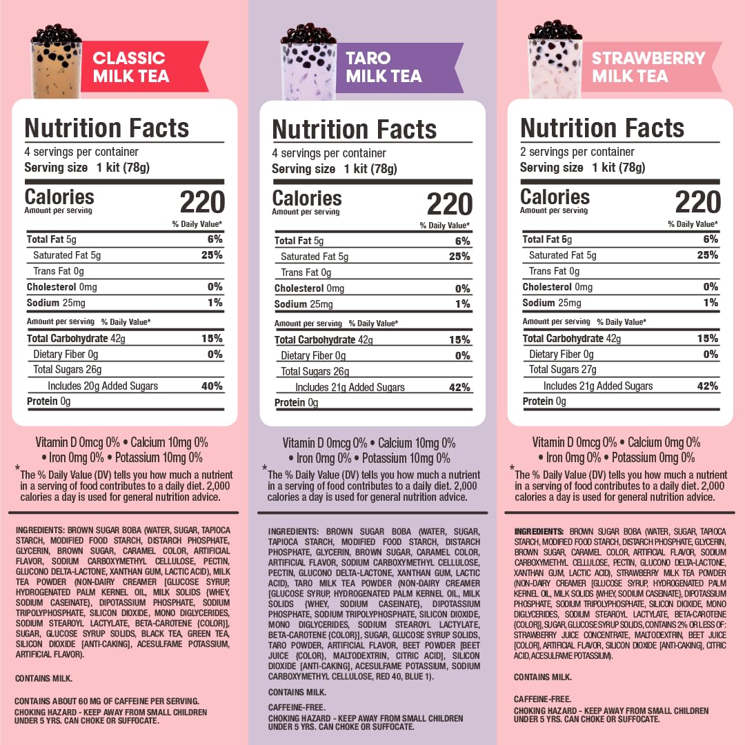 - WHAT IS INSIDE- 6 Individually wrapped portions of brown sugar flavored Pearl, 2 portions of caramel flavored Pearl, 2 portions of fruity flavored Pearl, 4 classic milk tea packets, 2 creme brulee milk tea packets, 2 taro milk tea packets, 2 passionfruit pineapple green tea packets, & 10 extra wide paper straws. Store in a cool, dry place (no refrigeration necessary).