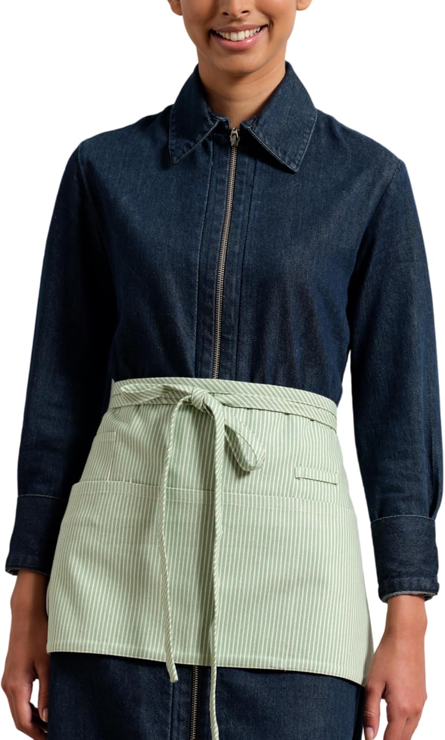 - THREE LARGE POCKETS: Our serving apron features 3 large pockets for holding payment book & money plus a smaller pocket for coins and a utility loop for tools. Waitress apron with pockets comes in 1-pack(pinstriped sage green) easy to tie around the waist. Extended Product 23x13 In