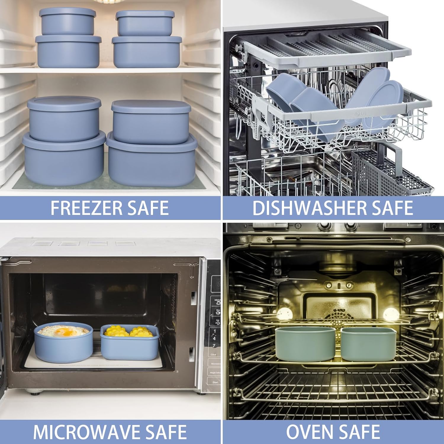100% Silicone Food Storage Containers with Lids, 8 Pack, 10oz to 51oz, Reusable Leakproof Nesting & Stackable Silicone Bento Lunch Box, Microwave Freezer Dishwasher Oven Safe, BPA Free, Slate Blue
