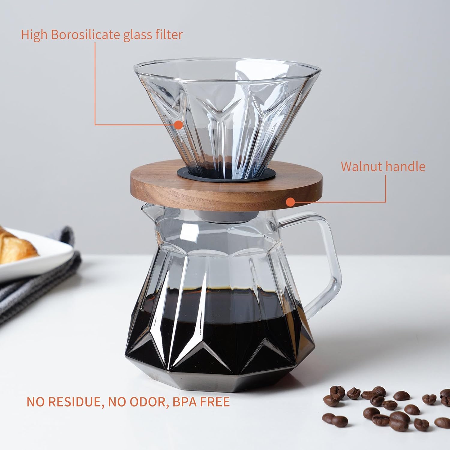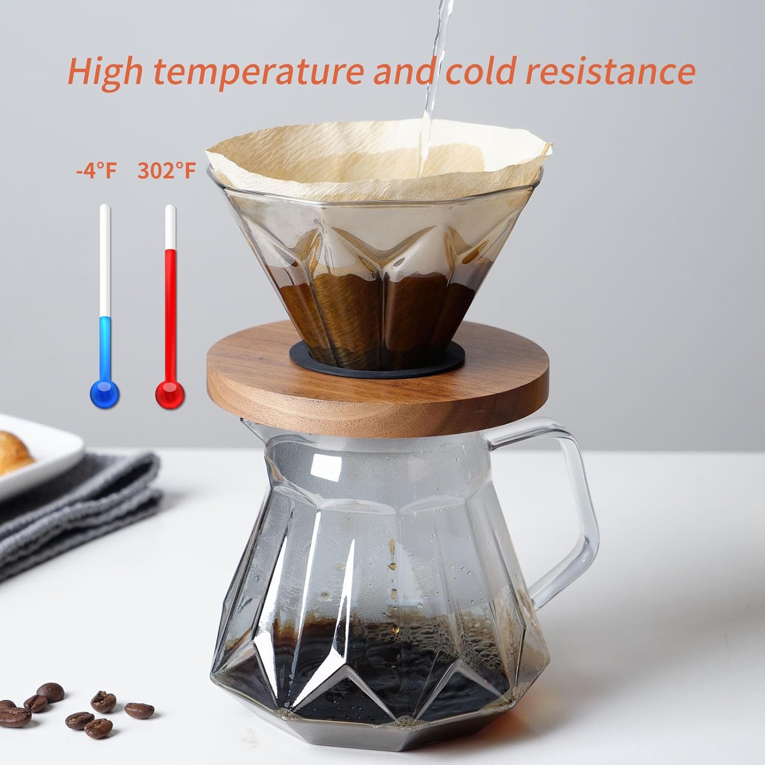 - 【Functionality】The coffee filter has a V shape to fully extract coffee.Borosilicate Glass Dripper with Walnut Handle can be applied to most containers, including our commonly used mug or glasses cup. It is the perfect choice for pour over coffee lovers.