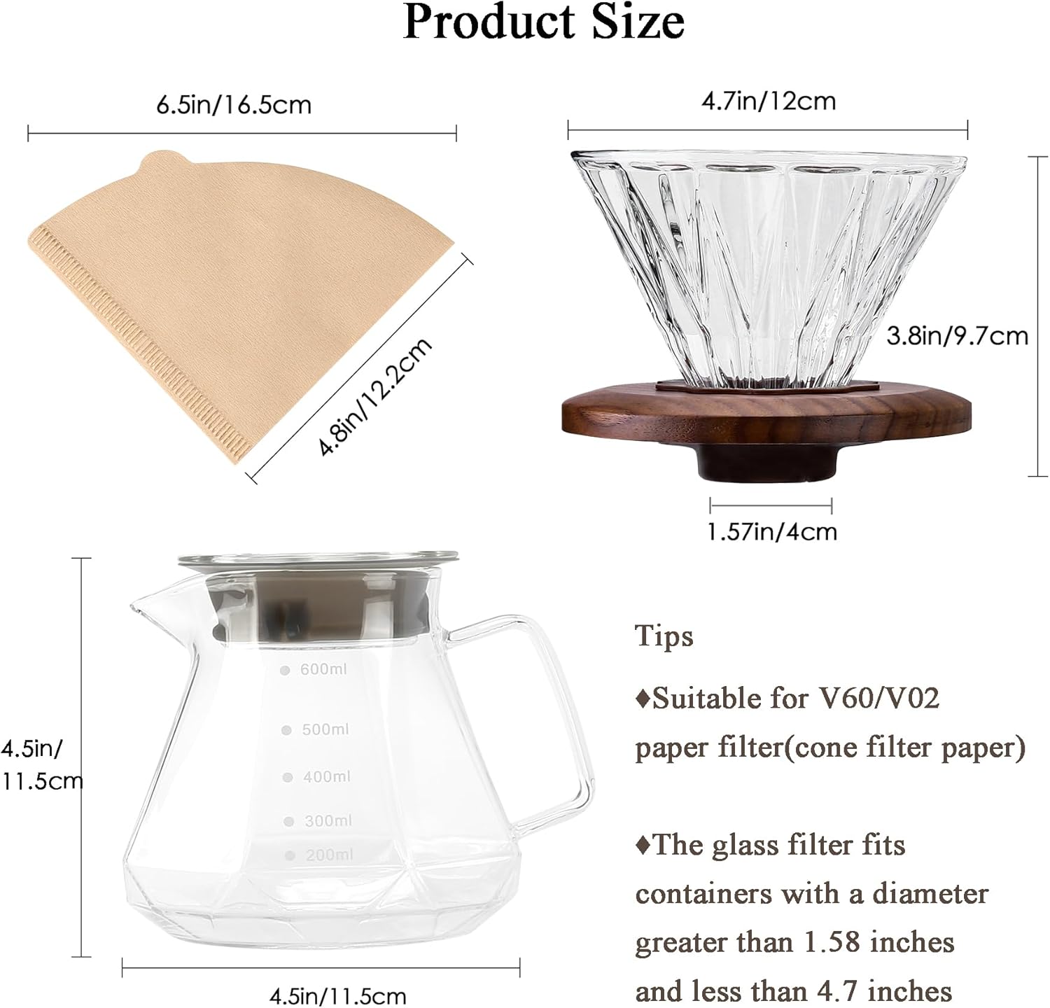Pour Over Coffee Maker, 20 oz Borosilicate Glass Carafe with 100 pcs Size 02 Paper Filter, Walnut Handle & Glass Lid, 600 ml, Clear