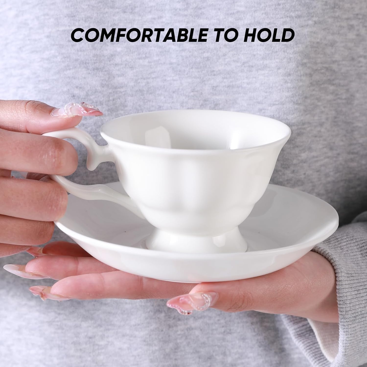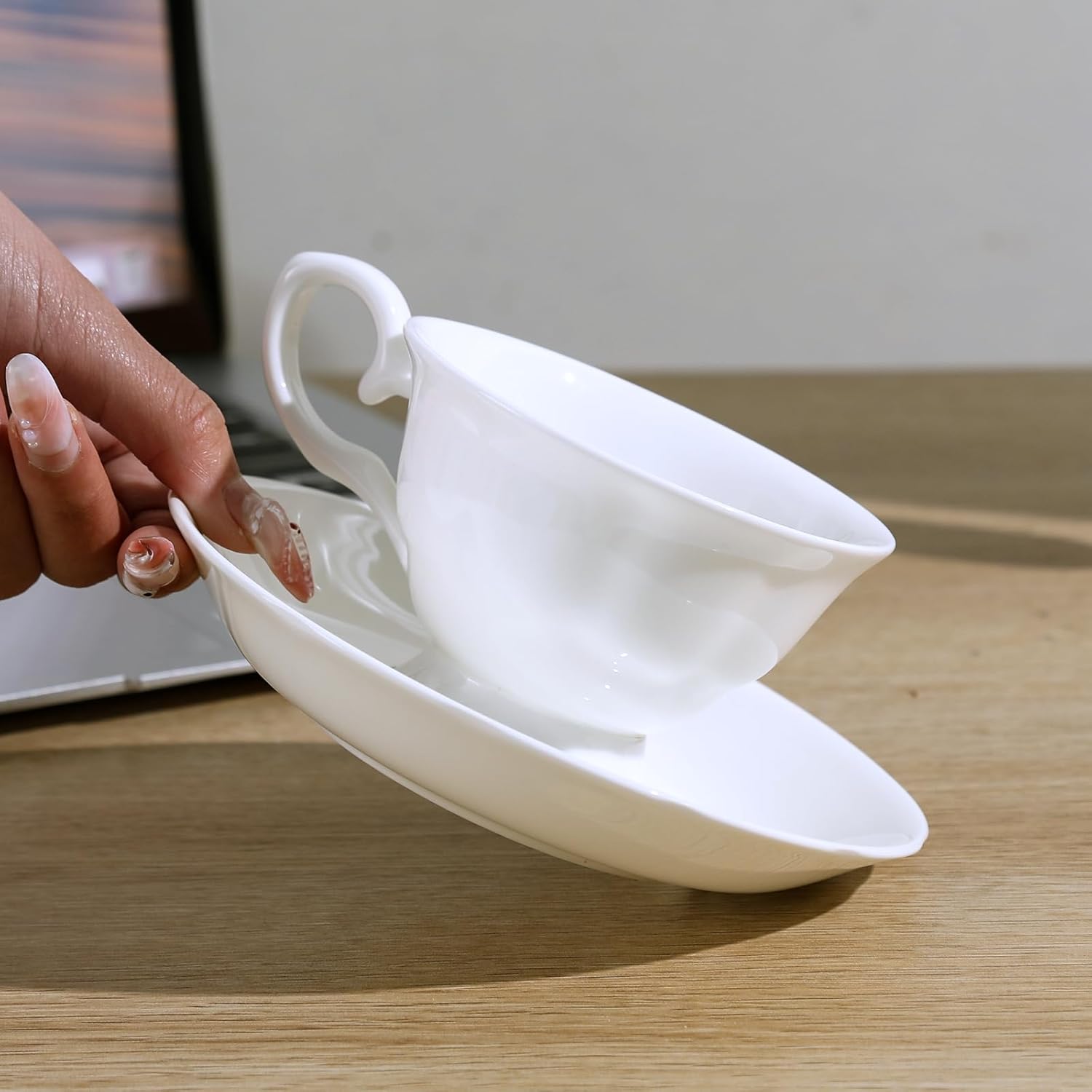 - [Luxury Bone China] Our cups and saucers are handmade from high-quality bone china. Compared to ordinary porcelain, they feature a more elegant whiteness, lighter weight, superior heat retention, and enhanced durability. When light passes through the cup's walls, it emits a soft, moonlight-like glow
