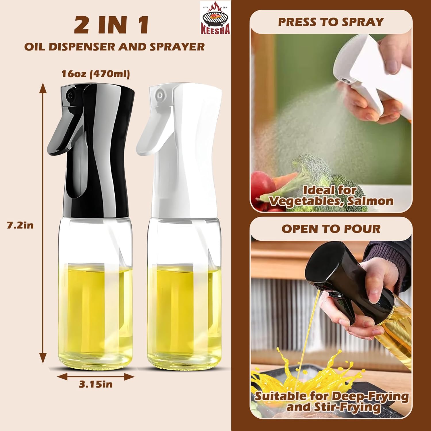 - 2 in 1 Oil Dispenser Bottle: Standard 16 oz Food Grade Glass Oil Spray Bottle with Pourer for Kitchen, Air Fryer and BBQ