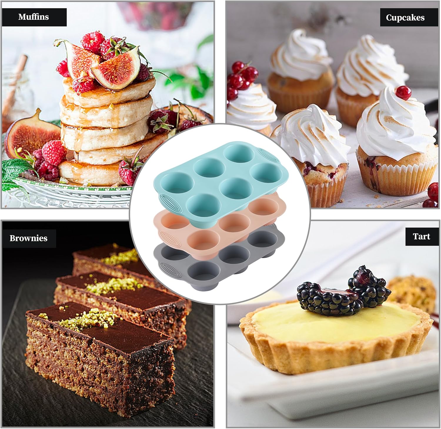 - 5.Stylish and fun 3-pack in vibrant colors: Add a splash of color to your kitchen with this attractive 3-pack silicone muffin tin set, featuring trays in gray, orange, and peacock blue. Not only are these silicone muffin pans for baking practical, but their stylish, modern design makes them a fun addition to any kitchen. Ideal for gifting or upgrading your own bakeware collection, these muffin silicone molds combine functionality with a pop of personality.