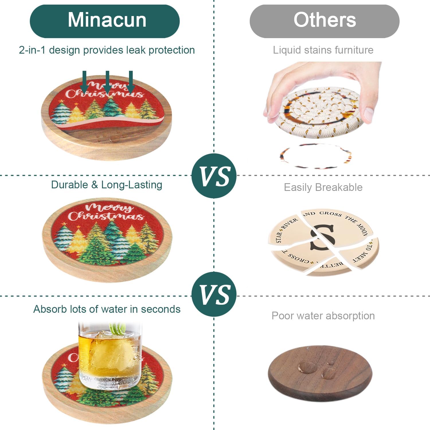 - 🎁Non-slip & Non-stick cups: Minacun Wooden coaster with 4 soft anti-slip pads on the bottom, which protect the surface of your furniture from scratches or damage, and prevent sliding all around; high-quality felt has good absorption that doesn't stick on the glass when you pick up the drink, prevents falling and noise, suitable for cold or hot drinks.