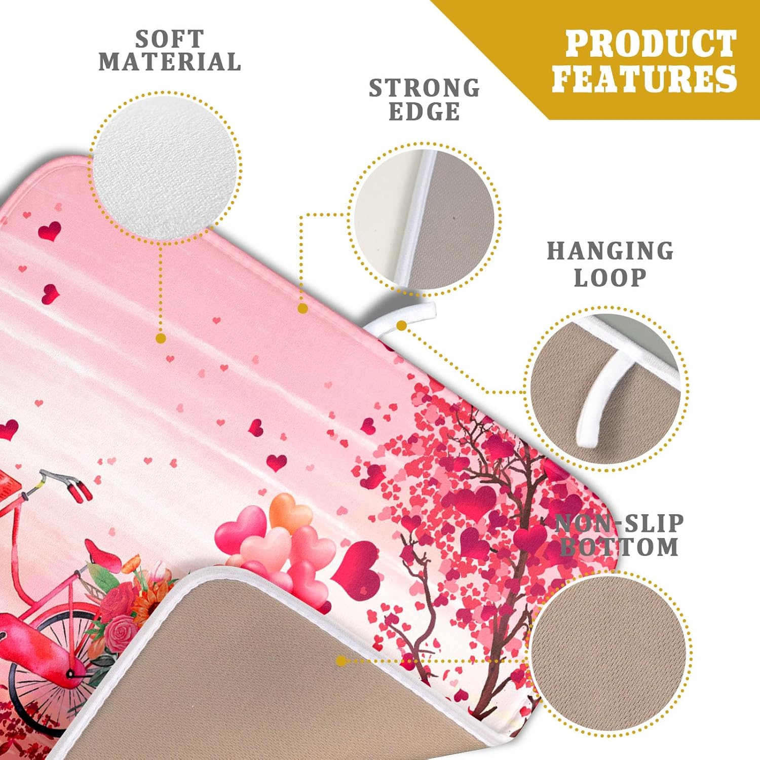 Pink Heart Valentine's Day Gnomes Dish Drying Mat for Kitchen Counter,Pink Bicycle Love Tree Drying Mat 16 x 18 Inch with Absorbent Reversible Microfiber Dish Drying Pad Dish Rack Pad for Coffee Bar