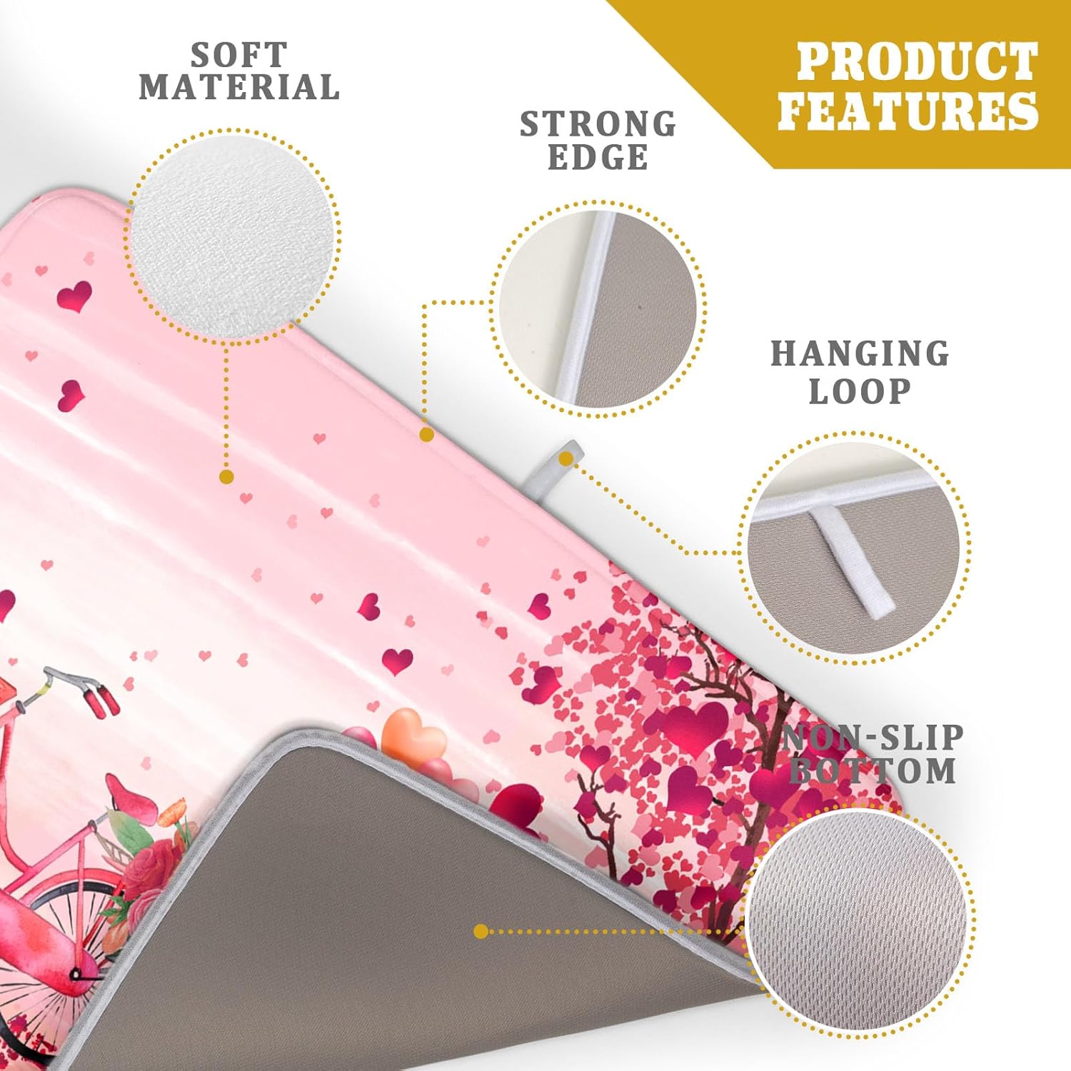 Pink Heart Valentine's Day Gnomes Dish Drying Mat for Kitchen Counter,Pink Bicycle Love Tree Drying Mat 18 x 24 Inch with Absorbent Reversible Microfiber Dish Drying Pad Dish Rack Pad for Coffee Bar