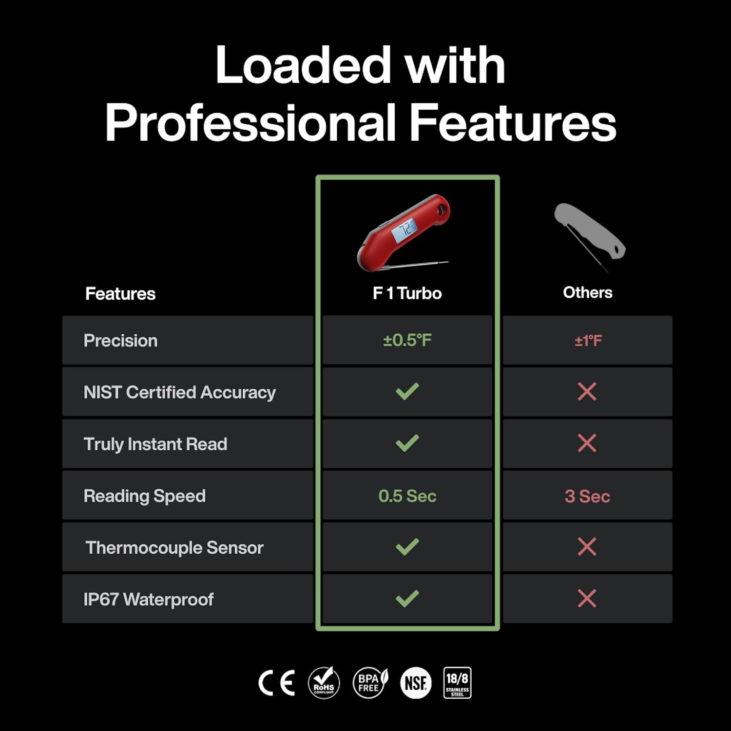 - Industry-leading 0.5s Response Time: Our patented thermocouple technology places the sensor on the tip of the probe, allowing for direct contact with the heat.