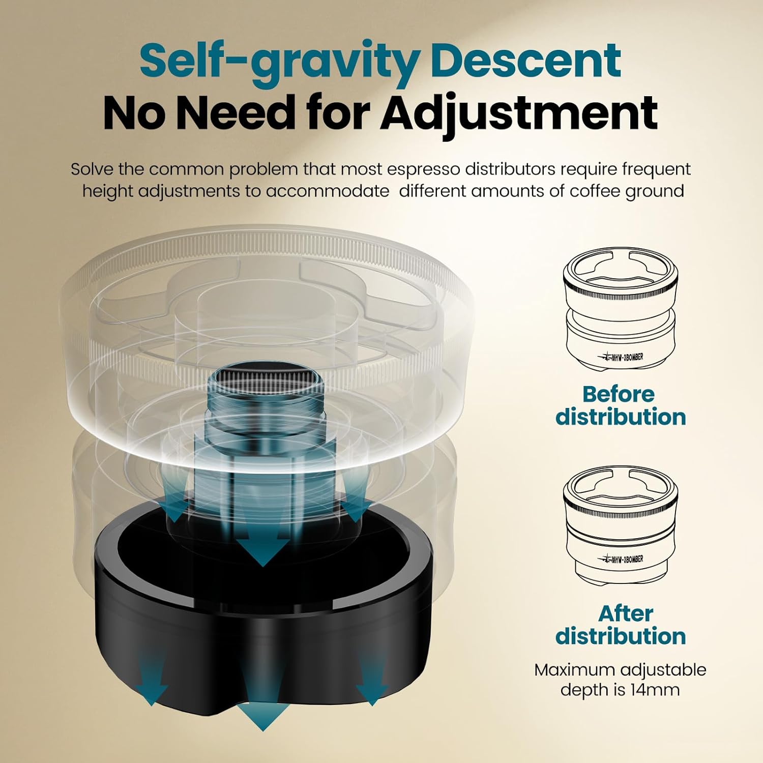 - 【Adaptive Gravity】This 51mm coffee leveler innovatively connects the base and top cover along a central axis, allowing for natural and uniform descent driven by gravity, facilitating even powder distribution. It resolves the common issue of frequent height adjustments required by most distributors for varying powder quantities. (Maximum leveling depth approximately 14mm)