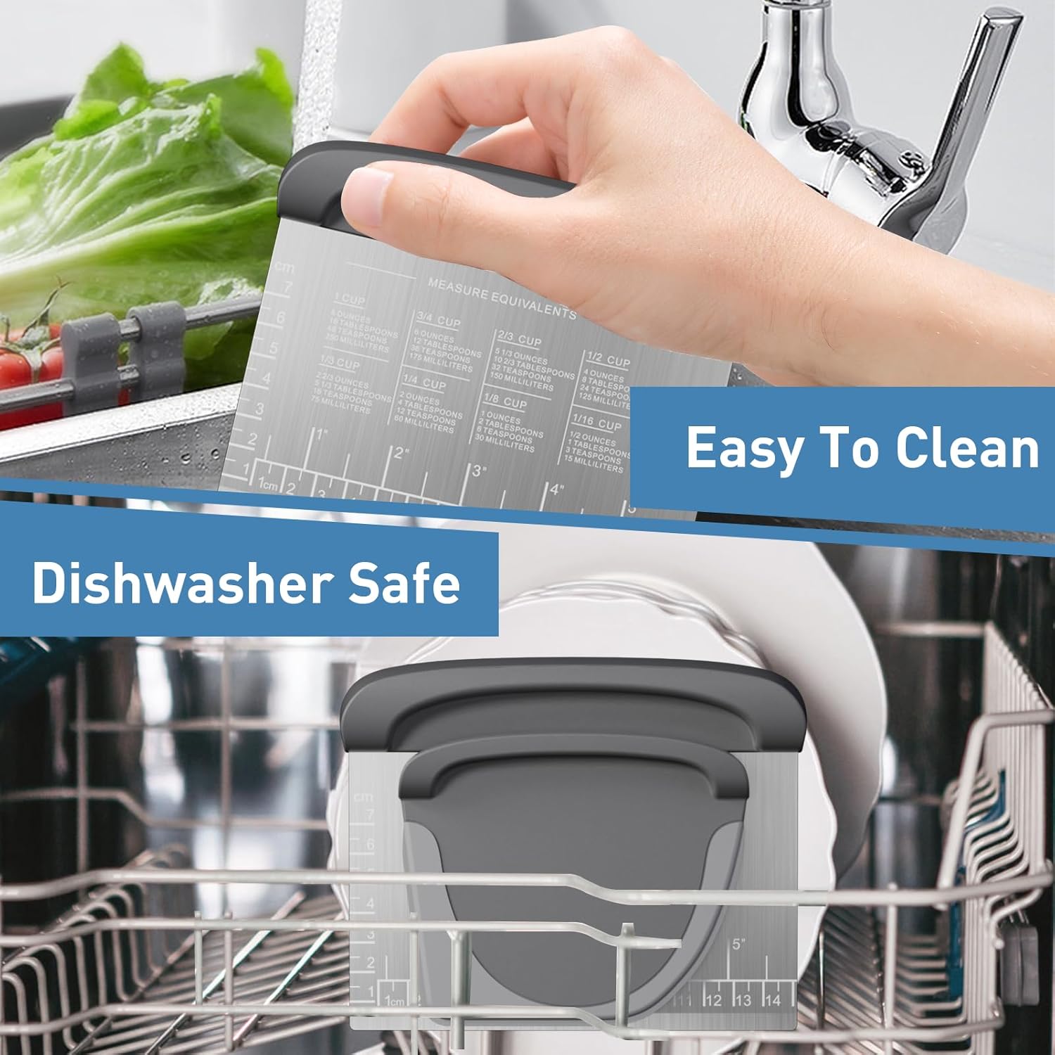 - 【Upgraded Design】This bench scraper kitchen has an ergonomic handle, prevents slipping and offers a firm and comfortable grip, minimizing hand fatigue during extended use. Food scraper stainless steel is designed with measurement markings and conversion chart which use advanced laser-engraved technology for easily measuring.