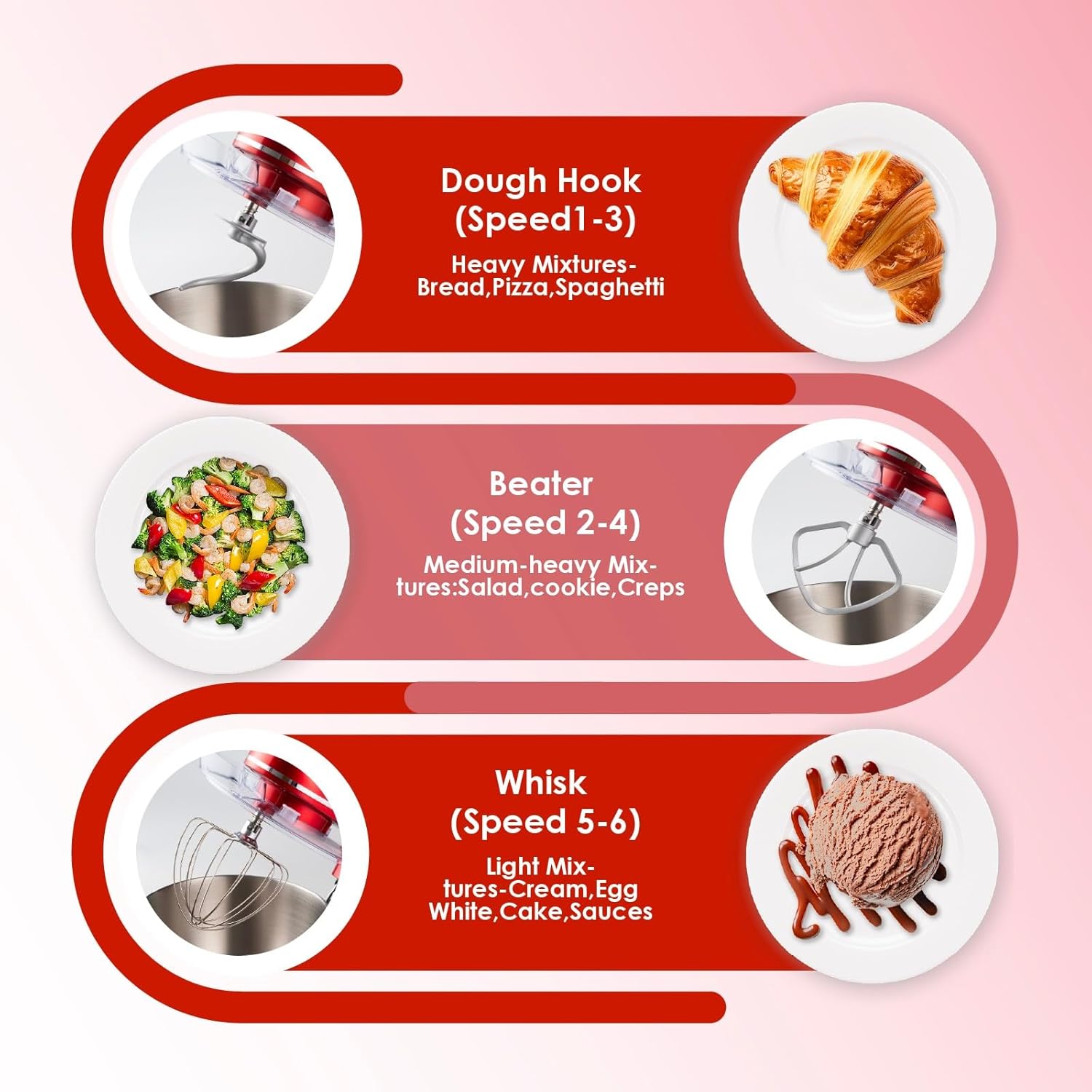 - 6 Speed, Easy to Use: This kitchen mixer features six adjustable speed settings and easy operation to meet your diverse mixing needs. The tilt-head feature allows for effortless switching between bowls and attachments.Its intuitive design ensures ease of use, making it ideal for both beginners and experienced bakers, delivering reliable performance for baking tasks.